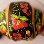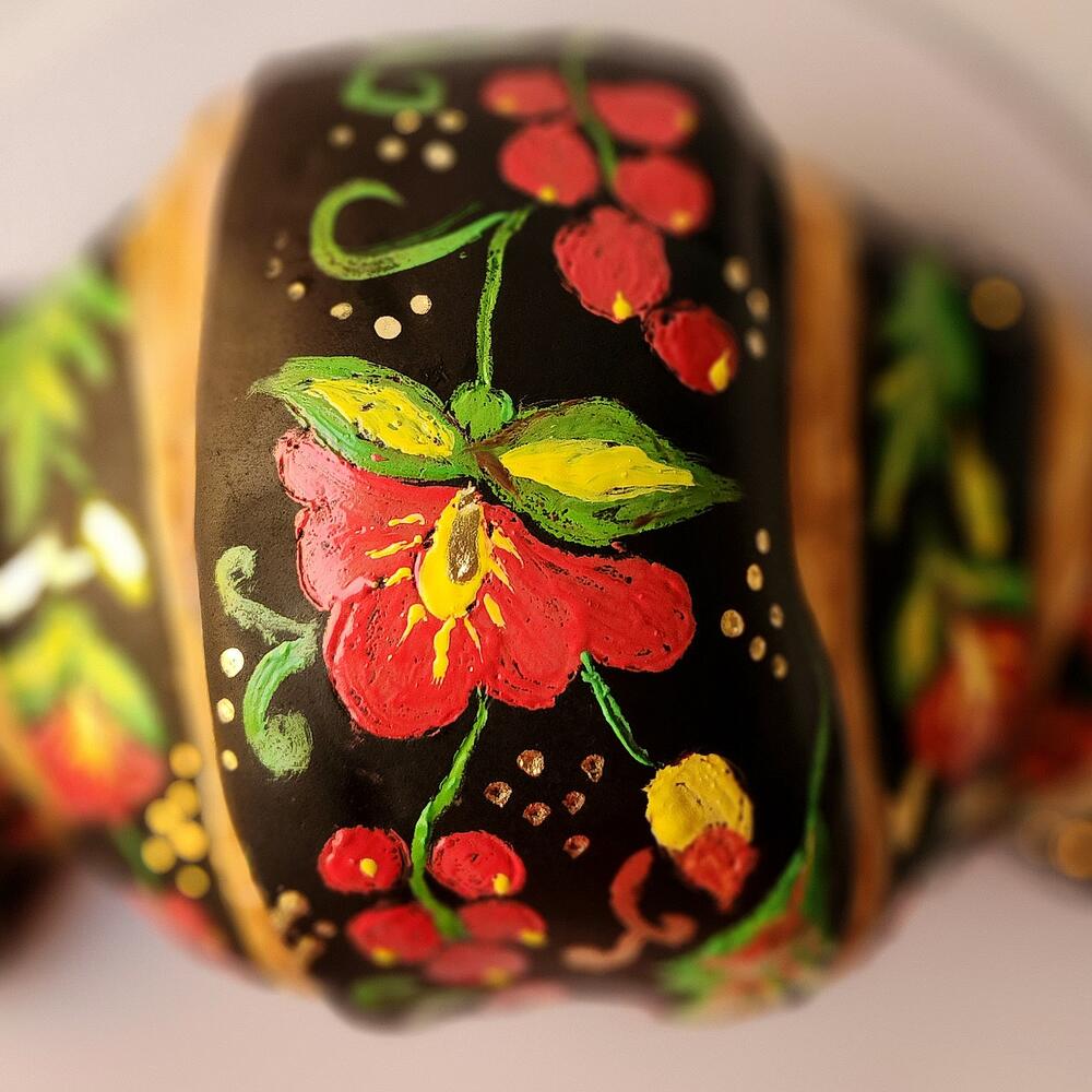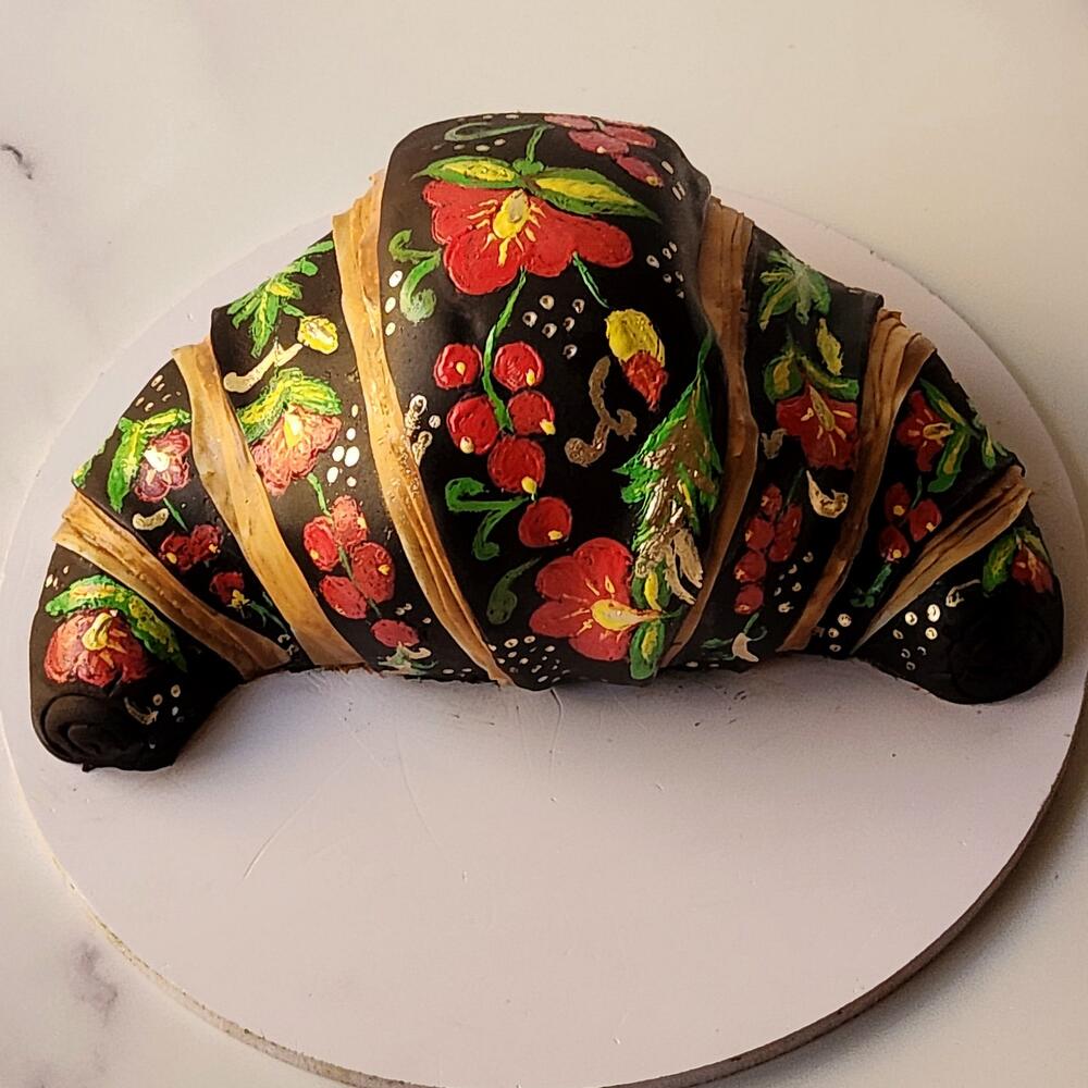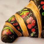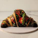 Cake in the shape of a croissant. Decorated in the style of Russian traditional painting Khokhloma. Inside is hidden a very delicate cake milky girl with raspberries. How do you like the result?