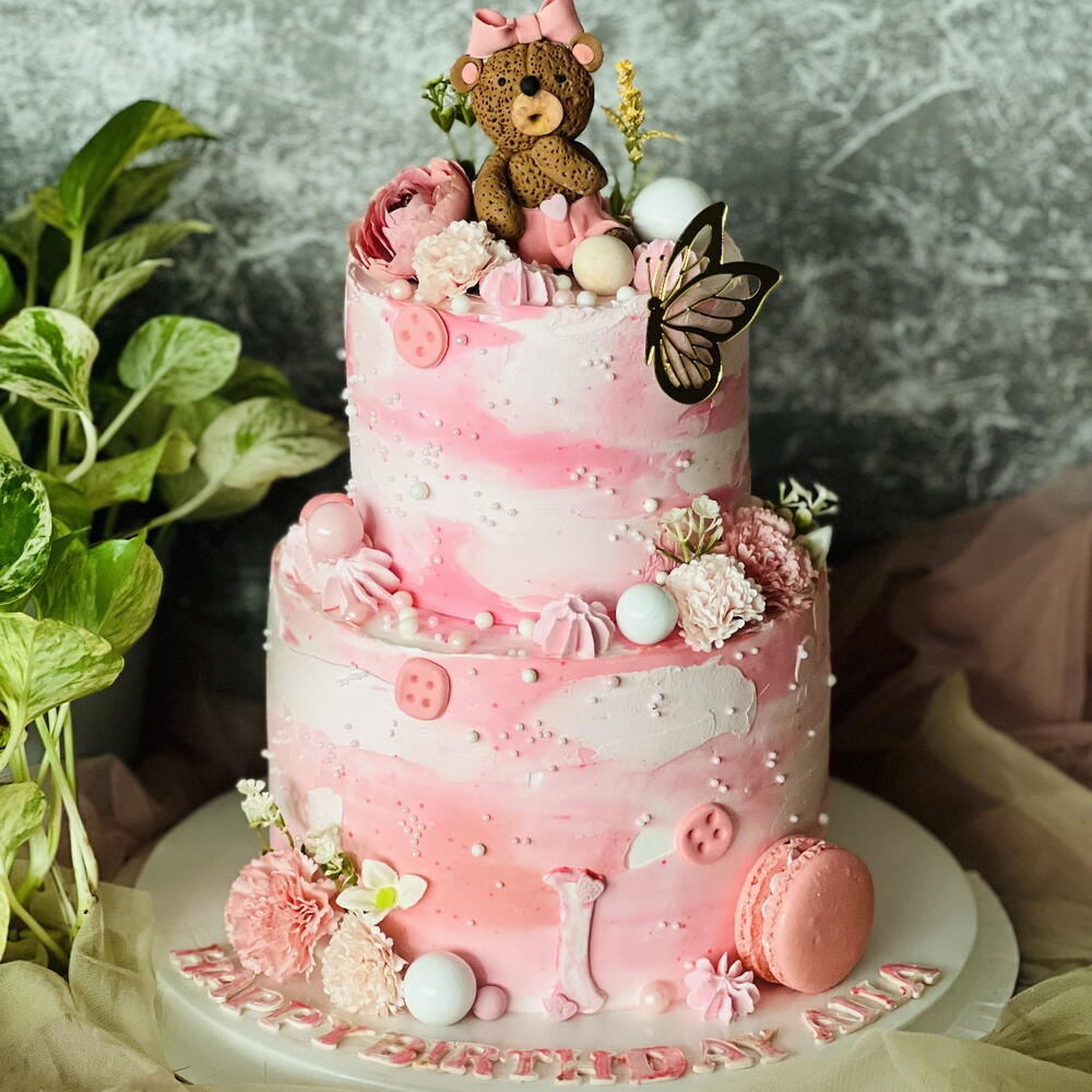 Classic taste of Choclate cake with Choclate base, moist and fudgy in layers. It's filled with rich Choclate ganashe & chocochips inside to make cake more sweeter&yumminess. It's a birthday cake for girls with teddytheme.