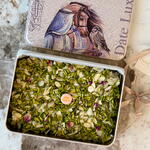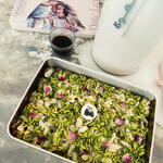 Khalas dates, tahina, buiscits(flour, milk, sugar), almonds, pistachio, rose petals