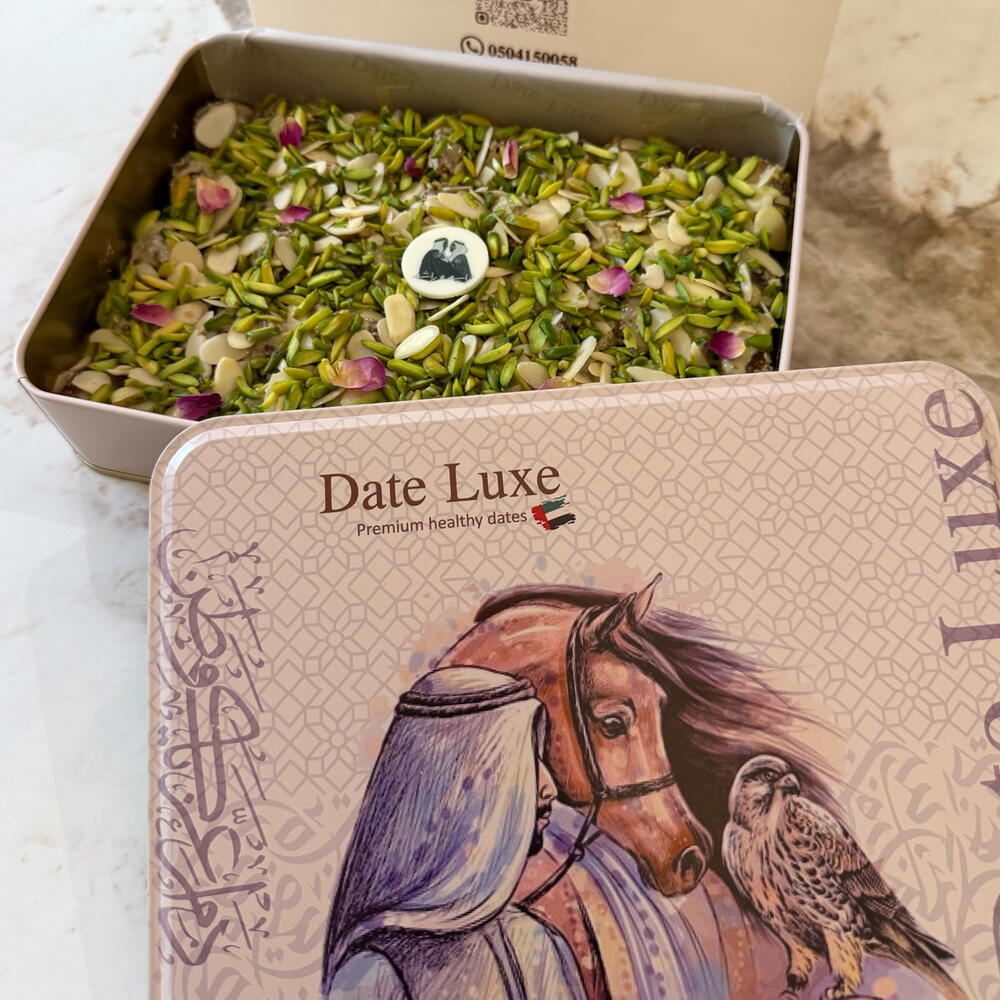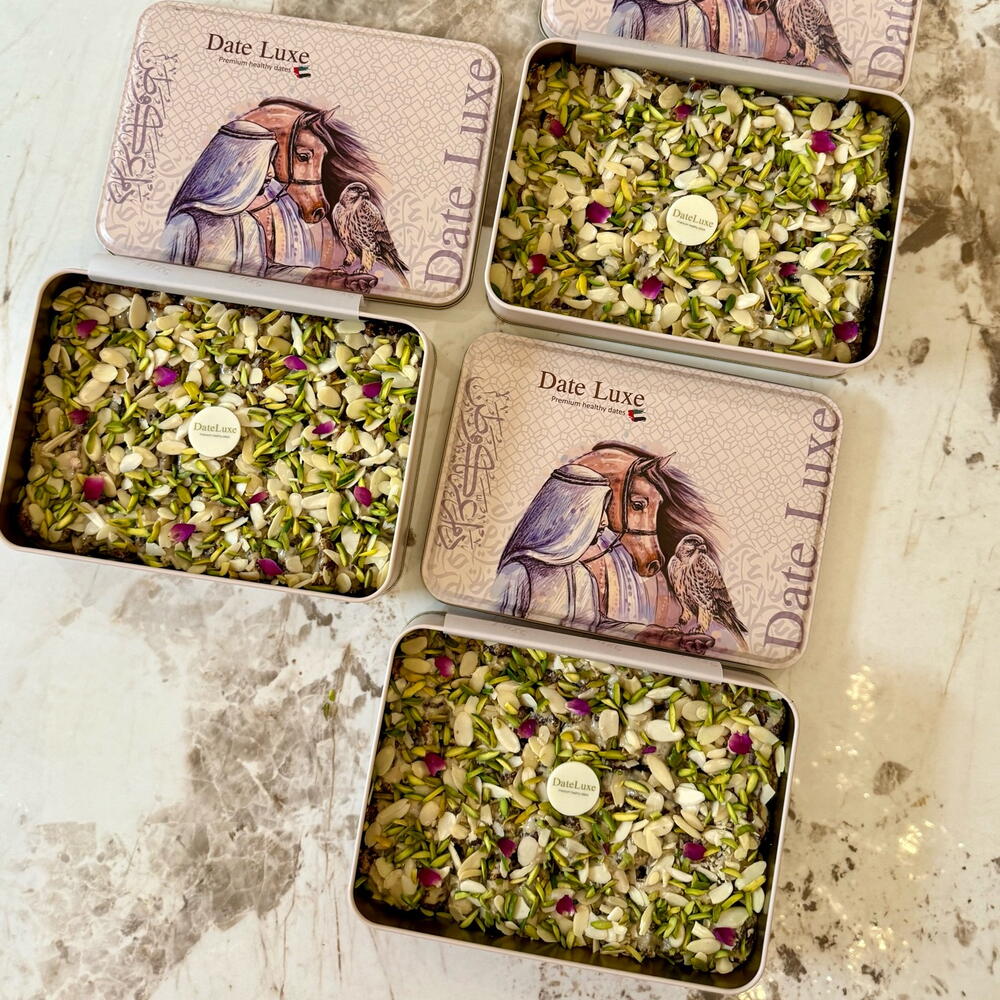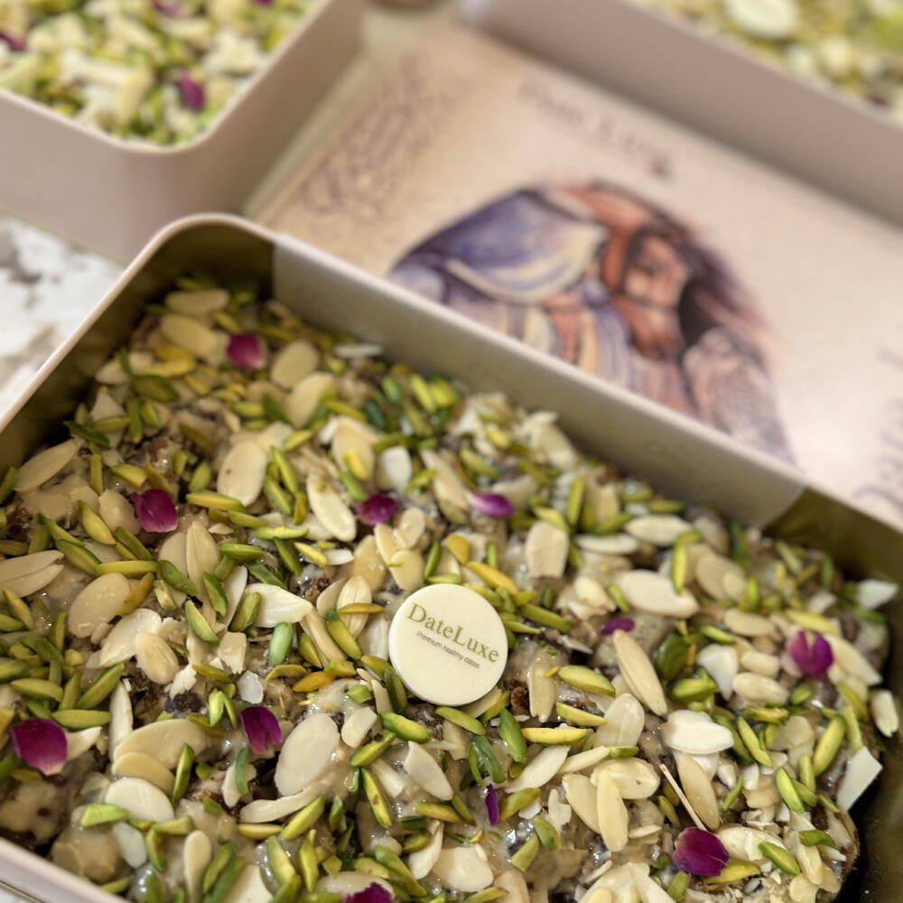 Khalas dates, tahina, buiscits(flour, milk, sugar), almonds, pistachio, rose petals
