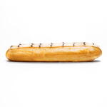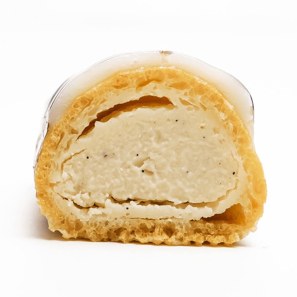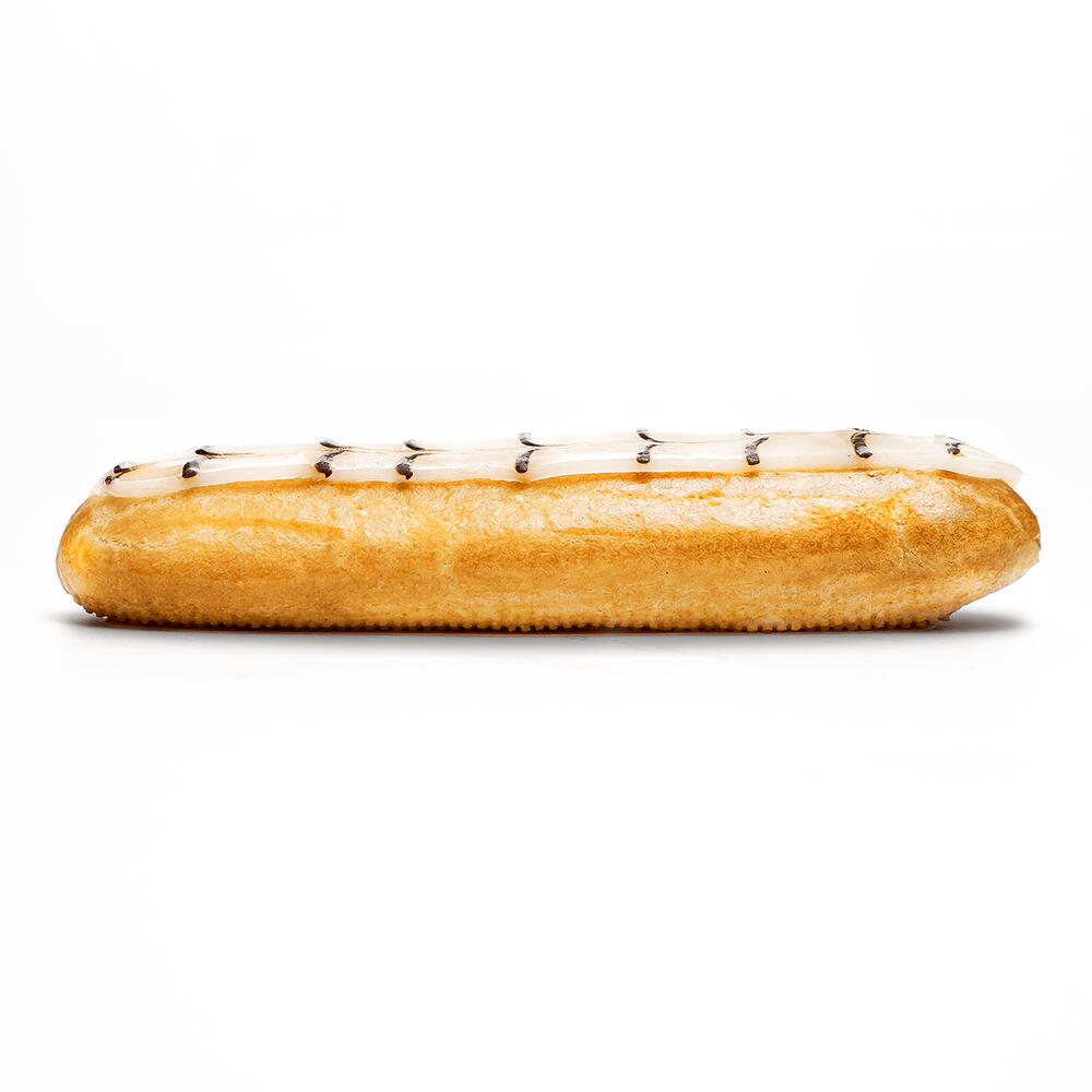 Eclair: water, milk, sugar, salt, butter, flour, egg Cream: gelatin mass, milk, glucose syrup, white chocolate, neutral gel, white coloring titanium dioxide, vanilla paste.