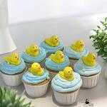 Vanilla Cupcake Base: • All-purpose flour – 150g • Sugar – 130g • Baking powder – 1.5 tsp • Salt – a pinch • Unsalted butter (softened) – 75g • Eggs – 2 large • Milk – 100ml • Vanilla extract – 1 tsp ⸻ Blue Frosting: • Whipping cream or butter (unsalted) – 150ml (or 100g butter) • Icing sugar – 60g (adjust to taste) • Vanilla essence – 1/2 tsp • Sky blue gel food color – a few drops ⸻ Decorations: • Yellow duck toppers – made of fondant or modeling chocolate • Silver sugar pearls – for bubble effect • Edible glue or water – to stick fondant parts if needed
