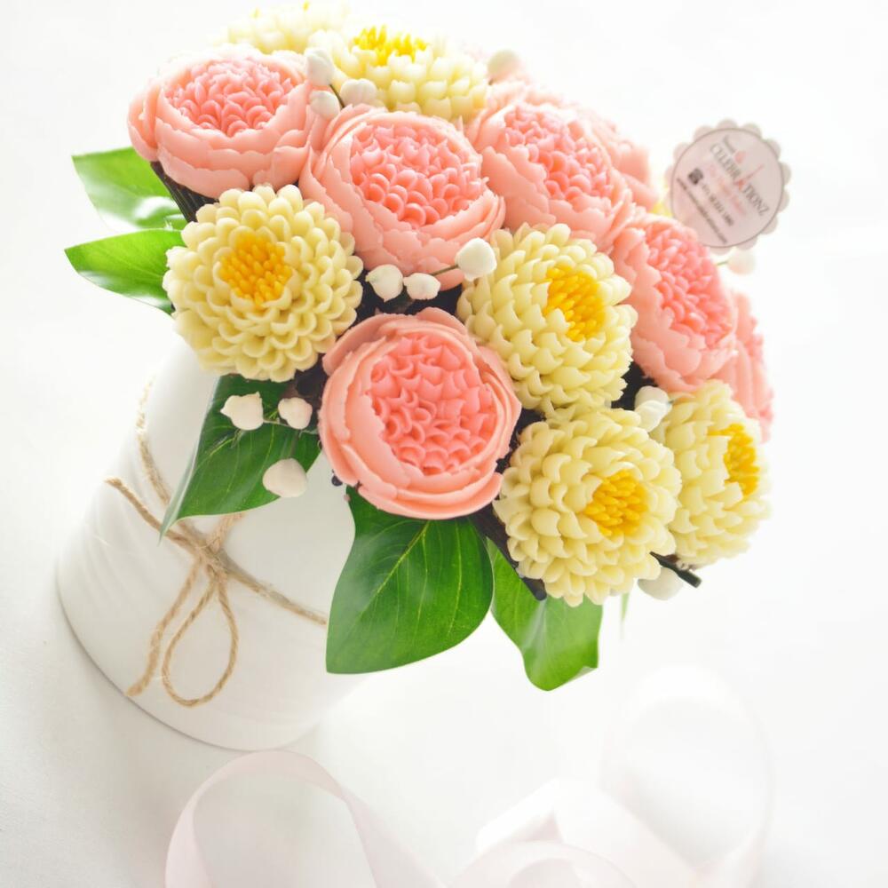 Modern, artistic and intricate - this edible cupcake bouquet will definitely glamorize your special events and celebrations. Order Now! Allergen Information: Please be advised that food prepared here may contain, milk, egg, wheat, soy, peanuts, tree nuts.