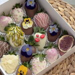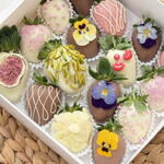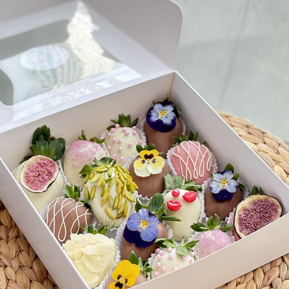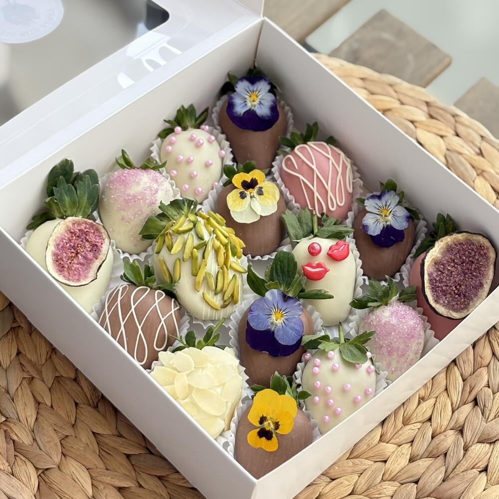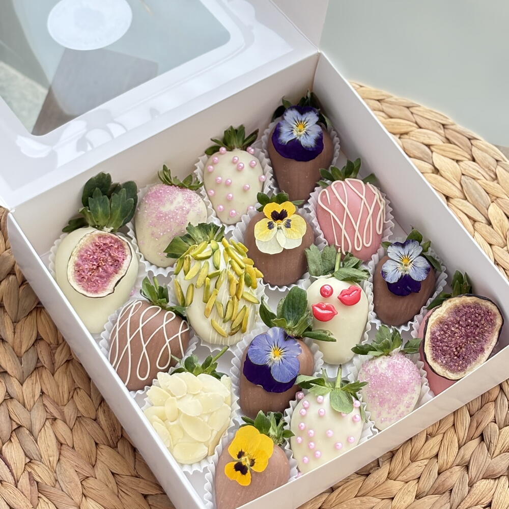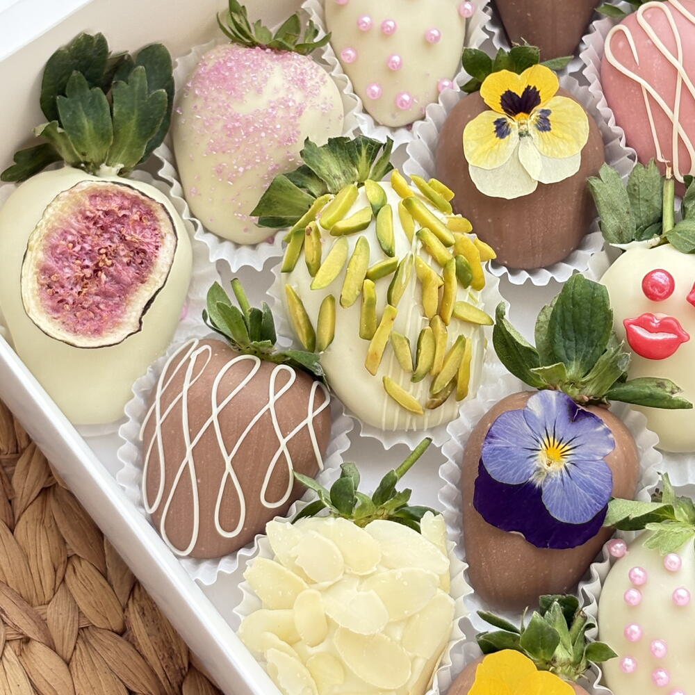 • Fresh strawberries • Belgian milk chocolate • Belgian white chocolate • Belgian ruby / pink chocolate • Edible flowers (viola, pansy) • Pistachio slices • Almond flakes • Freeze-dried fig • Sugar pearls decorative sprinkles ⚠️ May contain traces of nuts.