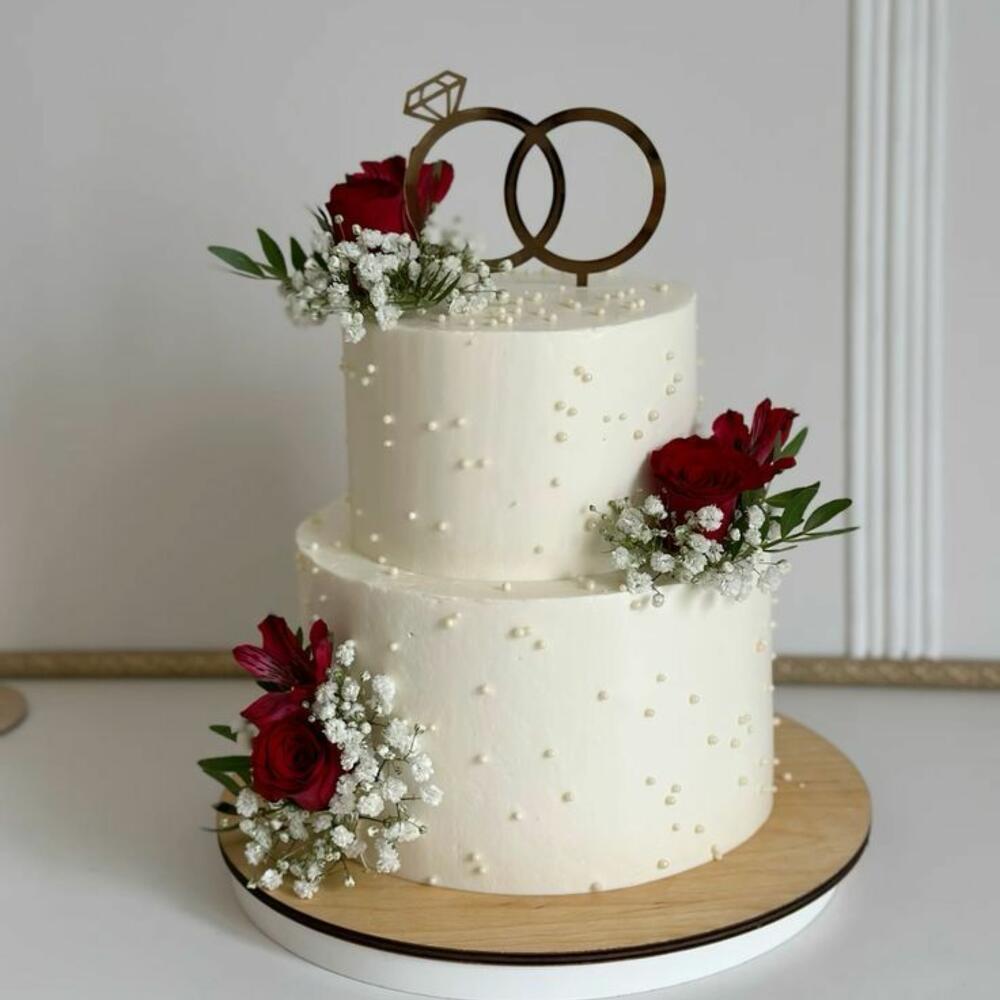 Fresh cream, soft spunch, Pearls, lemon curd ,fresh red roses, white gypsophila