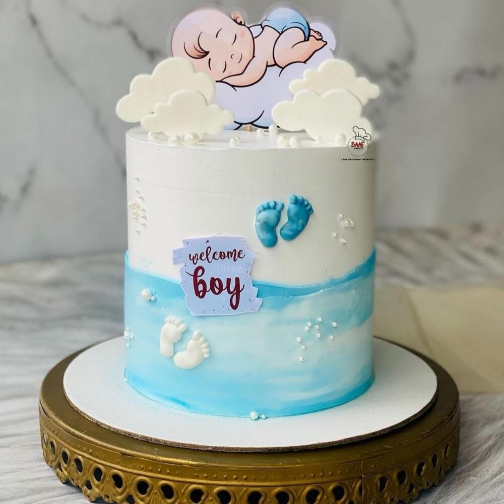 It's a milky custo cake for baby shower. Vanila cake with custurd filling, condensed milk, chocochips for crunchiness. It's delicious & finger licking one with soft cake. It's a gender revealing cake for babyshower who welcoming their boy baby.