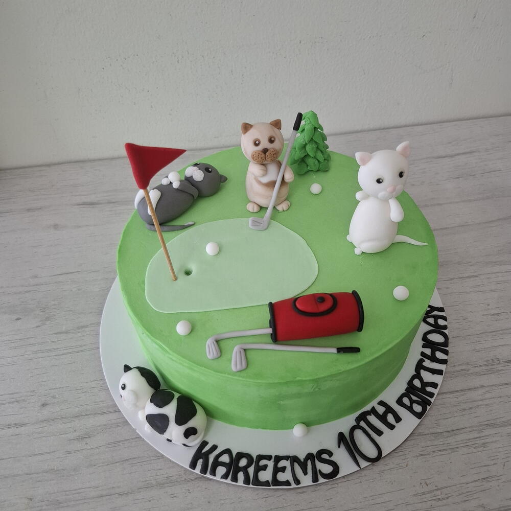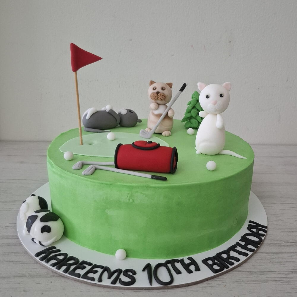 Celebrate your love for the game with this distinctive Golf and Cats Cake, intricately designed to resemble a golf ground Ideal for golf and cats enthusiasts, this cake captures the spirit of the game. Its fully customizable from our wide range of flavor, color, and frosting options, ensuring it matches your preference.