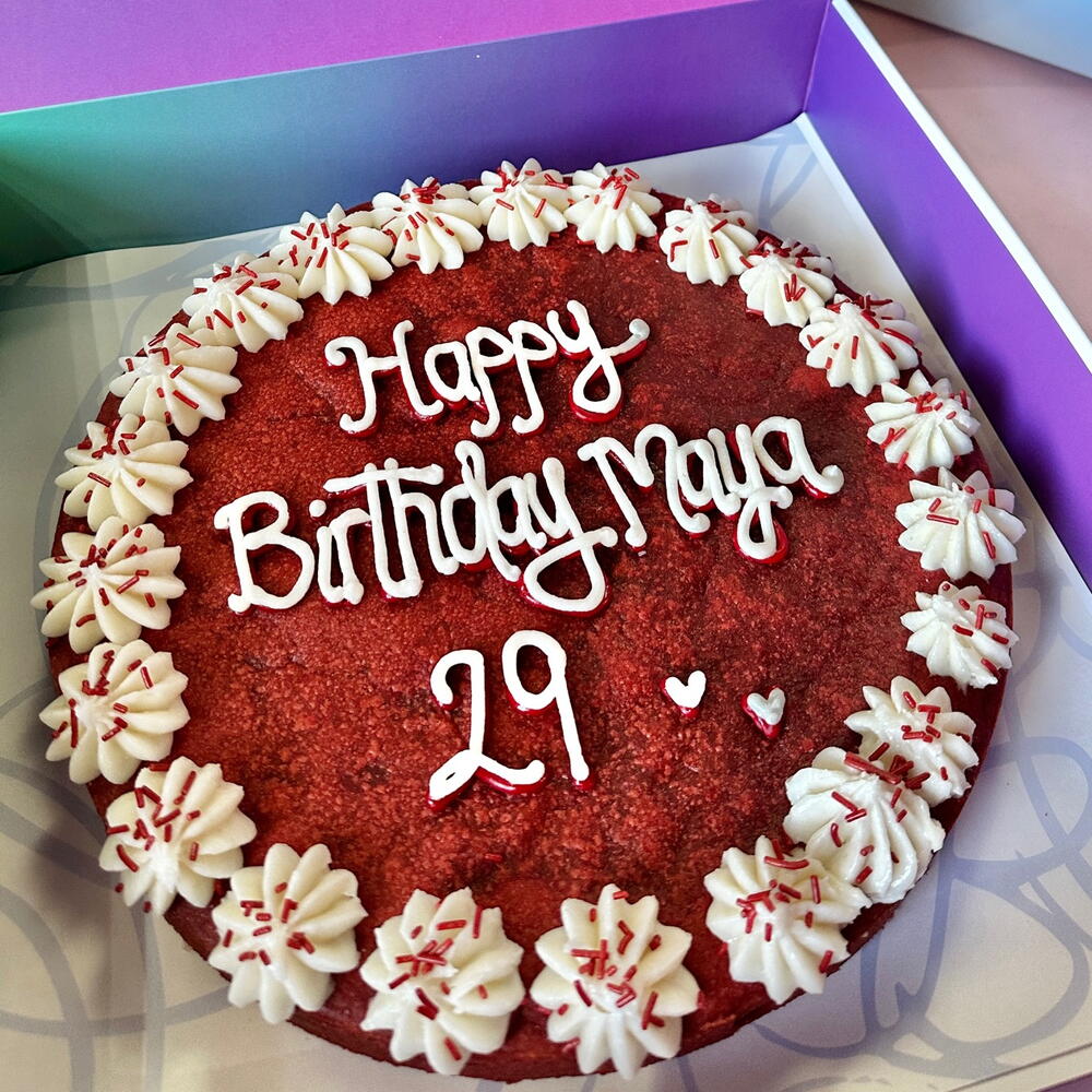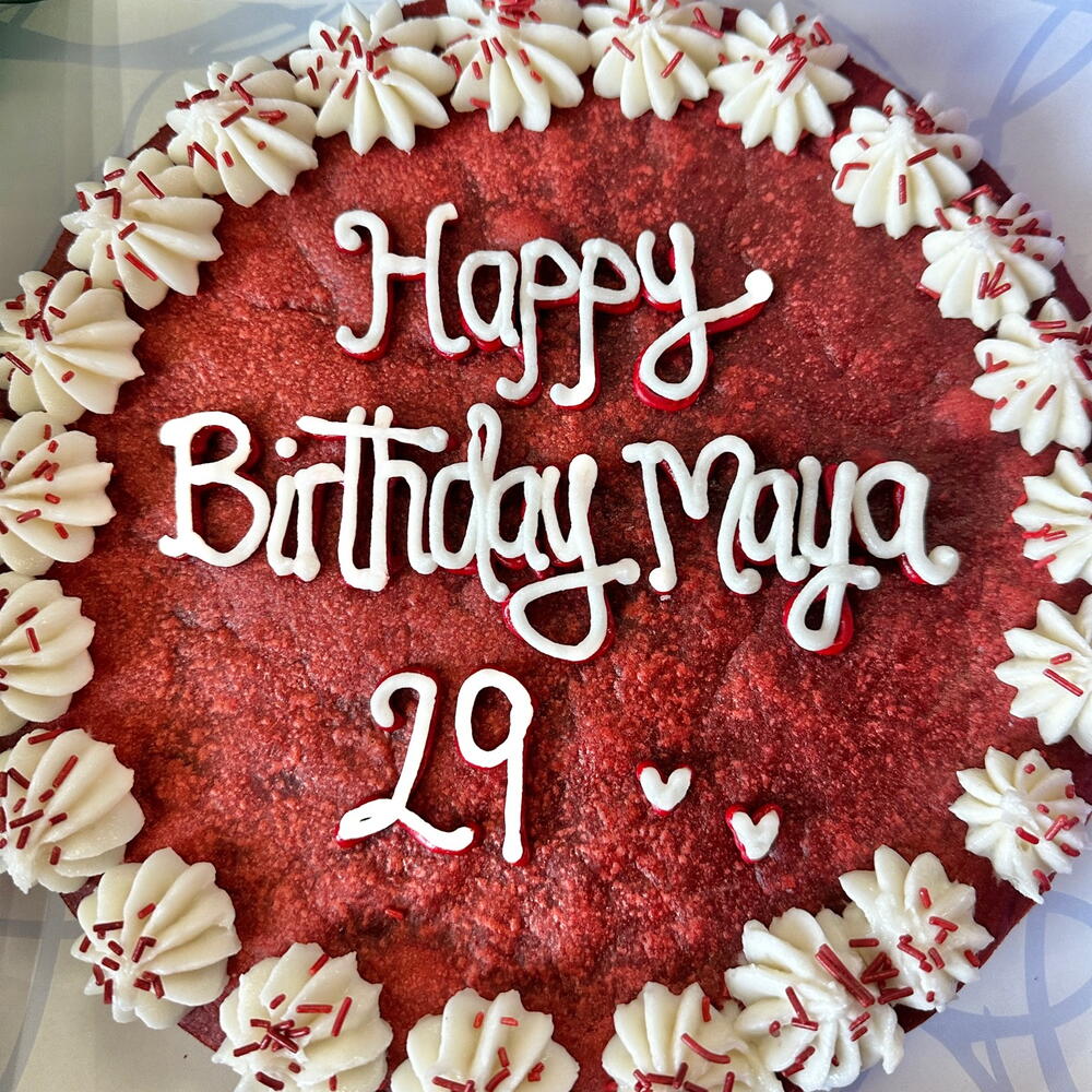 Delicious red velvet cookie cake stuffed with Nutella and milk chocolate chips. Message customizable.
