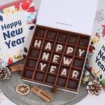 Brand - Sweecho, Text - Happy New Year, Type - Milk Chocolate, Quantity - 25 Pcs, Marble Chocolate Letters, Assorted Flavors - Pistachio, Cheesecake, Lotus, Hazelnut, Coffee, Cornflakes and Mix Nuts., Allergens - Nuts and Milk, Arranged in a Beautiful Gift Box.