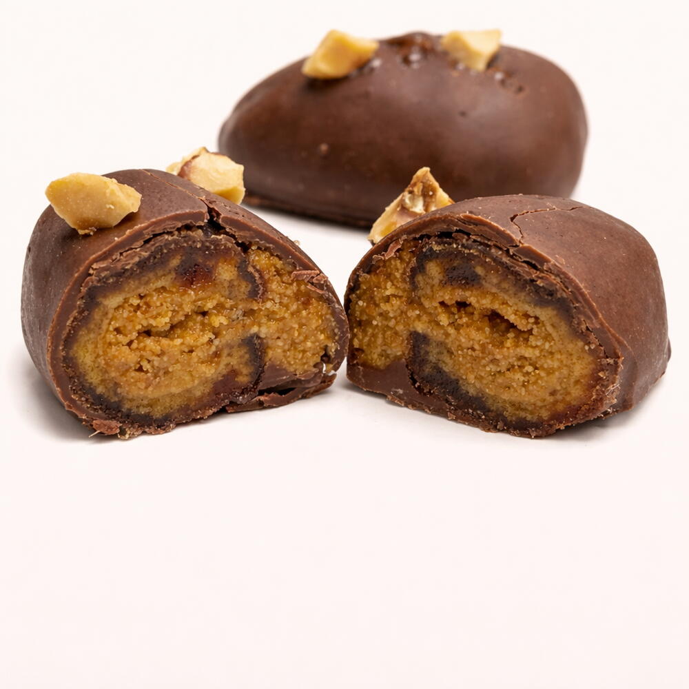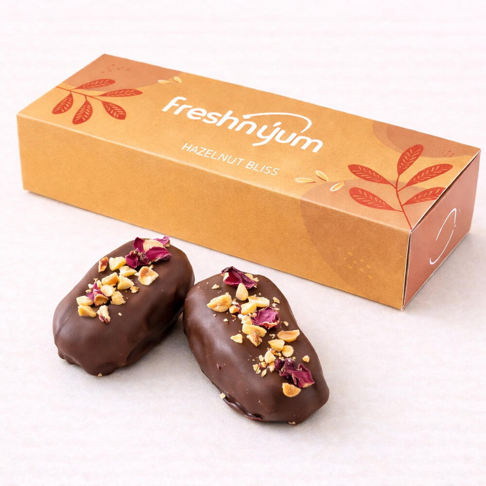 A sweat gift from nature. Soft Medjool dates, filled with Homemade Hazelnut, coated in dark chocolate with a pinch of sea salt.