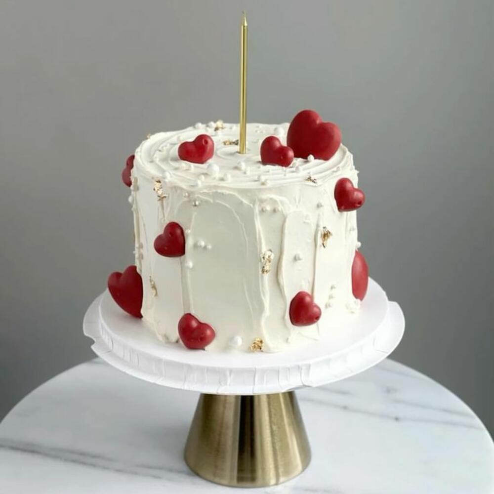 Classic elegance with a modern romantic touch. A minimalist yet charming cake featuring red hearts and golden love—great for engagements and intimate celebrations.