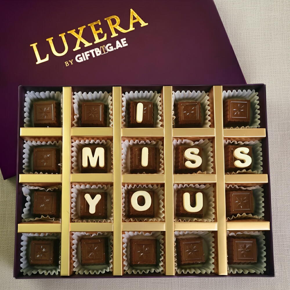 Your Gift Contains: - 20 pieces assorted Milk chocolate with I Miss You Message - Flavors: Pistachio Praline, Rice Crispy, Rocher, Speculoos, Hazelnut Praline Box Size:LxBxH: 24x18x4cm Handling and Storage: - Keep away from direct heat and sunlight - All our products are made to order and we suggest to store then in a cool dry place - Please see the bottom of the box for expiration - Suitable for vegetarians Allergy Info: PREPARED IN A FACILITY WHERE NUTS ARE USED