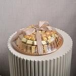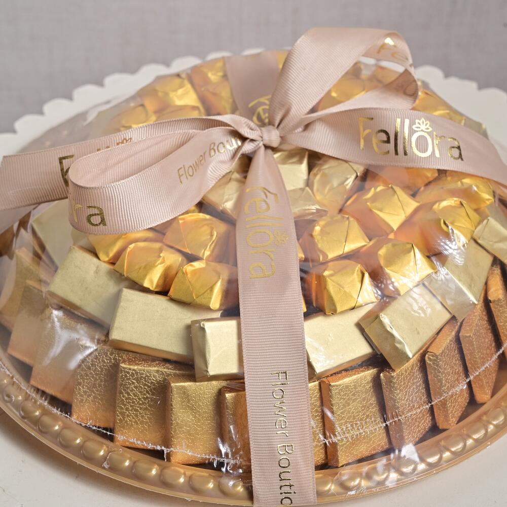 A luxurious chocolate gift platter elegantly presented with a Fellora signature ribbon — perfect for special occasions, corporate gifting, and festive celebrations. The assortment features premium chocolates made with sugar, whole milk powder, cocoa butter, cocoa powder, hazelnut cream, vegetable fats, powdered low-fat cocoa (12%), skimmed milk powder, emulsifier (lecithin E322), and artificial vanillin. Allergy Information: May contain traces of allergens: gluten, dairy, nuts, tree nuts, egg, sesame, soy. Storage Condition: Keep the chocolate gift in a cool, dry place away from direct sunlight or heat sources.