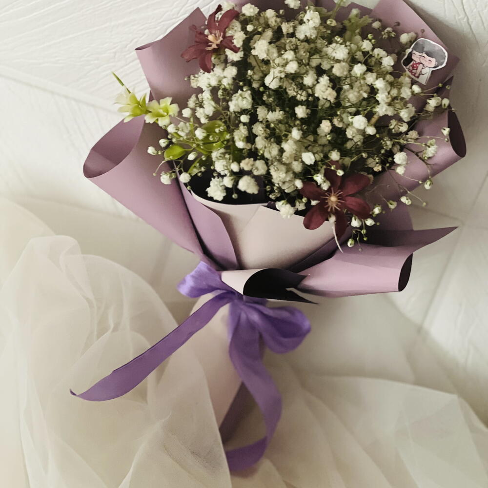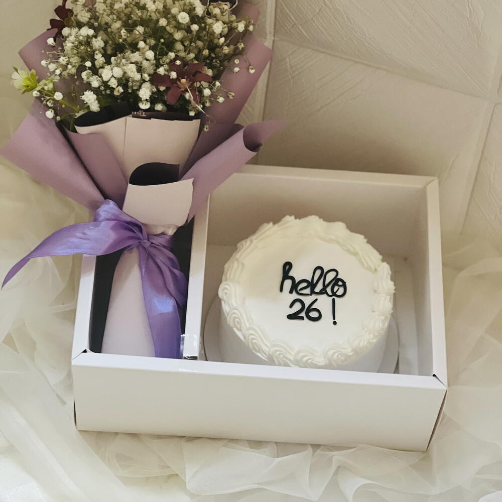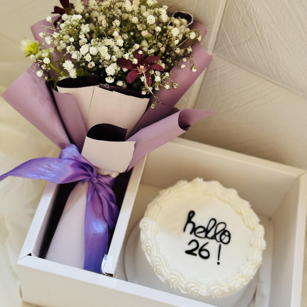 Vanilla cake with fission of strawberry crush white choclate chips.mini bouquet with cake best gift for ur loved ones.we can customize cake according to ur need
