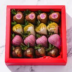4 Belgian dark chocolate covered strawberries with delicate gold touches 4 Belgian ruby chocolate covered strawberries with ruby chocolate drizzle 4 Belgian white chocolate covered strawberries with ground pistachio 4 Belgian milk chocolate covered strawberries with freeze-dried figs and golden accents