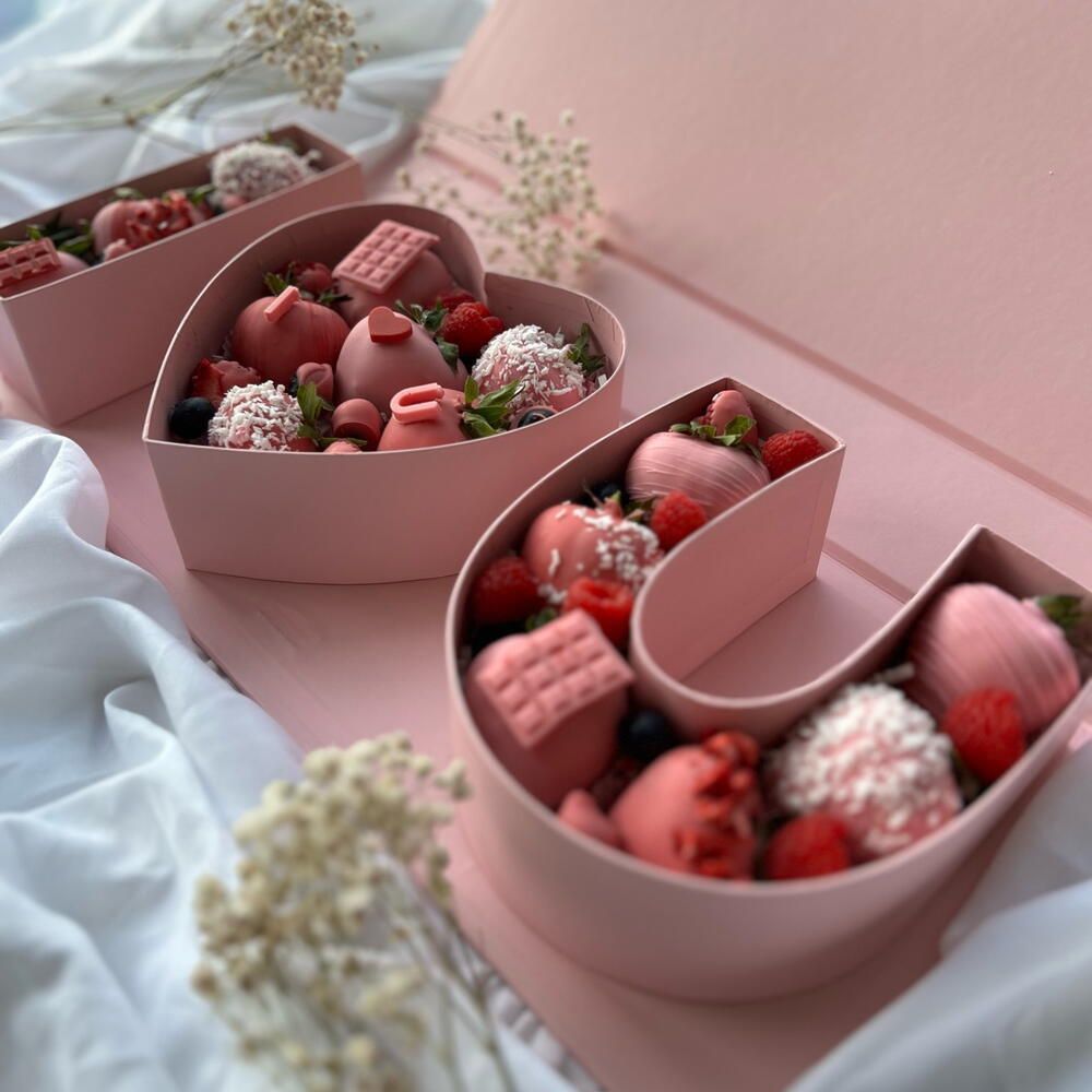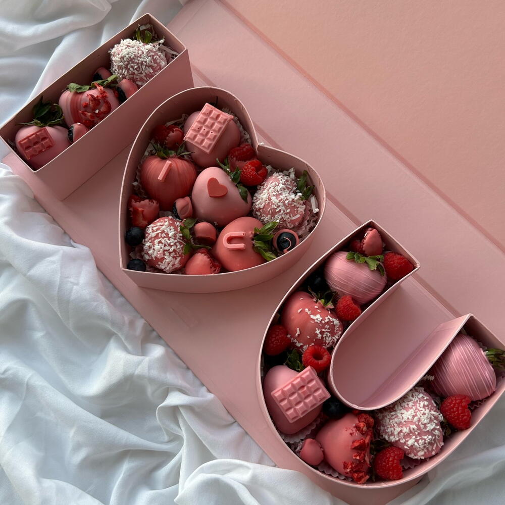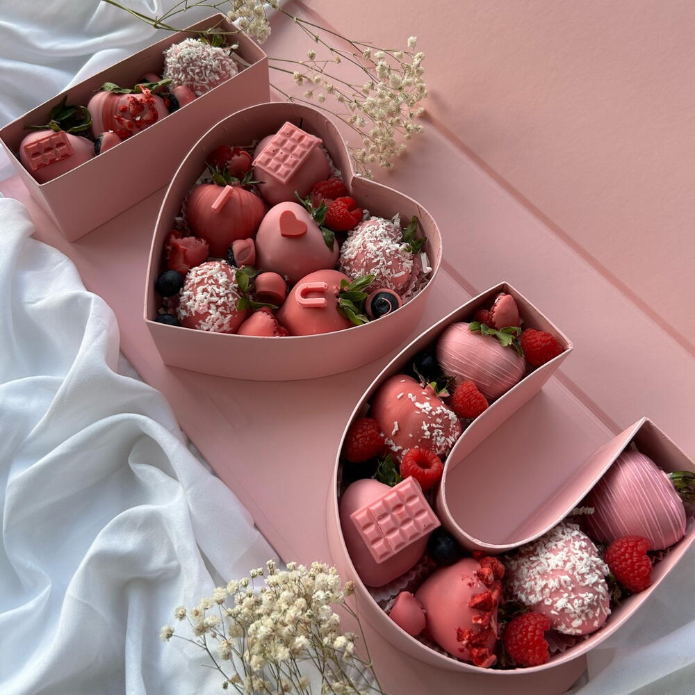 This gift box is perfect for saying I love you to someone special. Our deluxe gift box has it all: 14-16 juicy strawberries coated in white Belgian chocolate, colored in pink and red colors, adorned with crunchy nuts (almonds), sweet coconut, and luscious chocolate drizzle. And that is not all - we have added chocolate-covered raspberries and blueberries for extra indulgence. Customize your creation or choose from our pre-designed options.