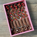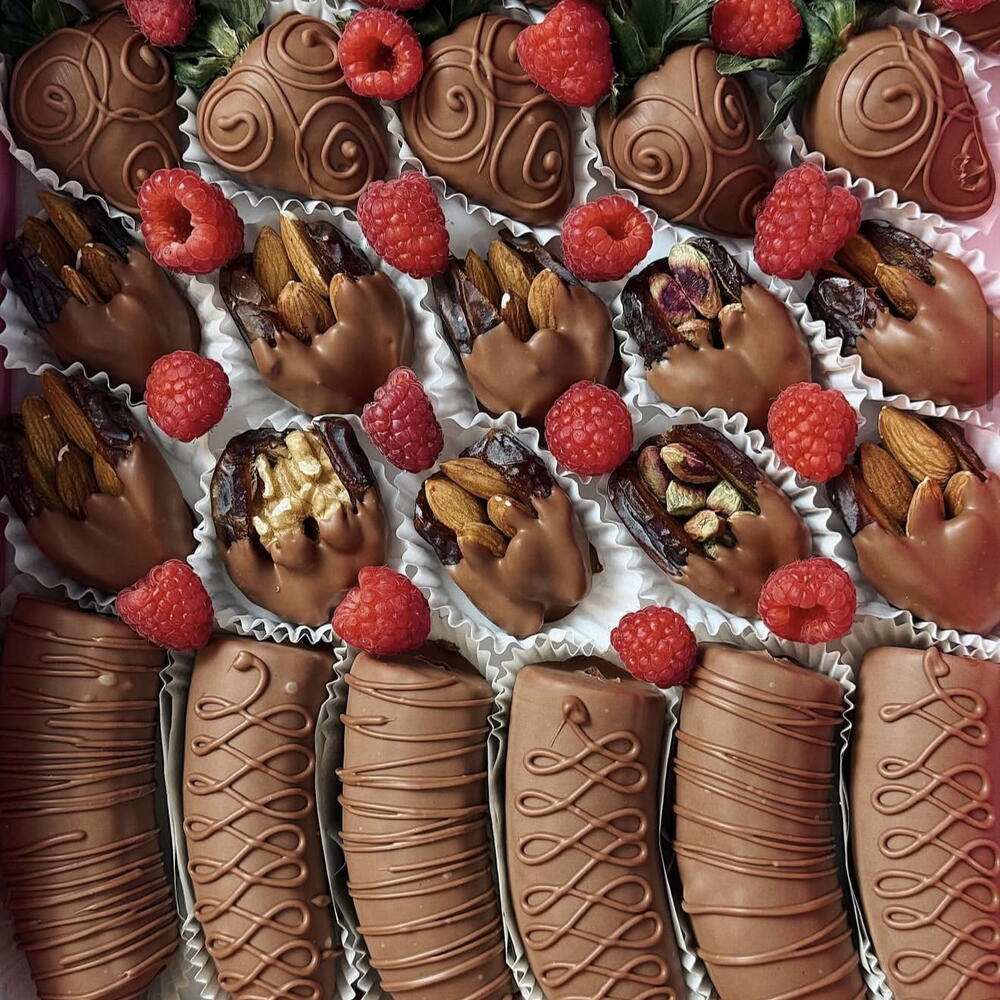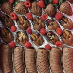 10 Chocolate-covered strawberries , 3 chocolate-covered bananas, 10 chocolate-covered dates, 70 chocolate-covered blueberries, 26 raspberries