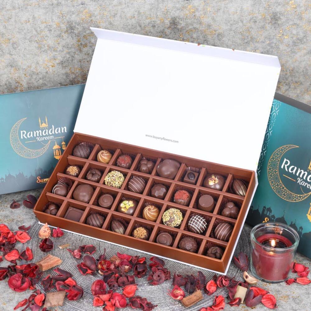 Product Details:-Brand - Sweecho, Type - Milk Chocolate, Quantity - 32 Pcs, Flavors - Pistachio, Coffee, Hazelnut, Salted Caramel, Cinnamon Etc, Allergens - Nuts and Milk, Arranged in a Beautiful Ramadan Gift Box