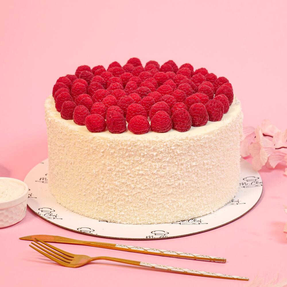 Indulge in the exquisite delight of this cake, elegantly layered with fluffy vanilla sponge infused with the rich flavors of coconut cream. Savour the gentle tang of raspberry cream, complementing the tropical richness perfectly. This heavenly delight promises a blissful journey for every dessert lover, adding a touch of luxury to any occasion.