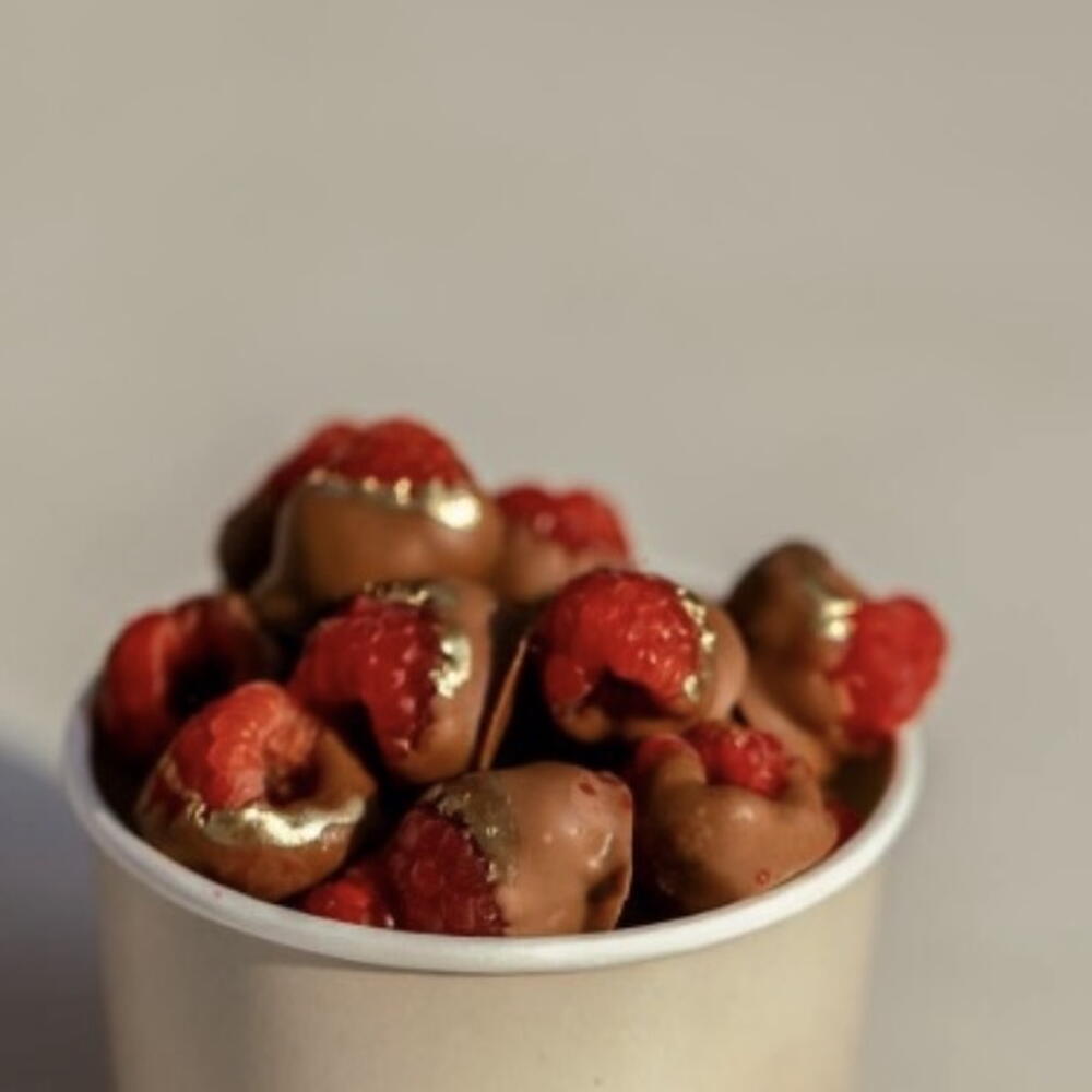 Indulge in Fraisias Rasberry Delight, a luxurious blend of succulent raspberries enveloped in rich, velvety chocolate. Each bite perfectly marries the refreshing juiciness of raspberries with the smooth decadence of premium chocolate, creating a delightful treat that pleases the palate.