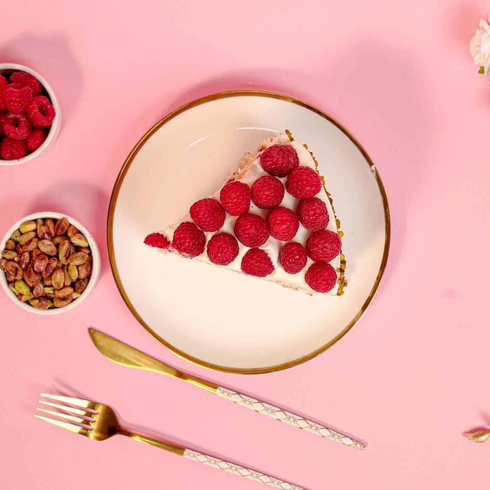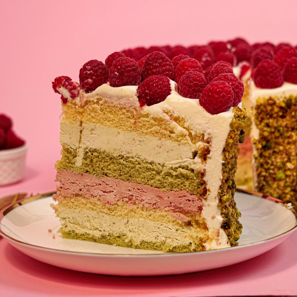 Feast on our luxurious cake, made following the secret recipes of Mr. Chef. Every bite of this delicacy offers a harmonious amalgamation of moist vanilla and rich pistachio sponge, layered with a luscious spread of homemade pistachio cream. The crowning glory of this cake is its sumptuous raspberry cream that adds a tangy freshness, perfectly balancing the nutty undertones of pistachios. Dive into this culinary masterpiece that promises an unforgettable journey of exquisite flavors and textural contrasts.