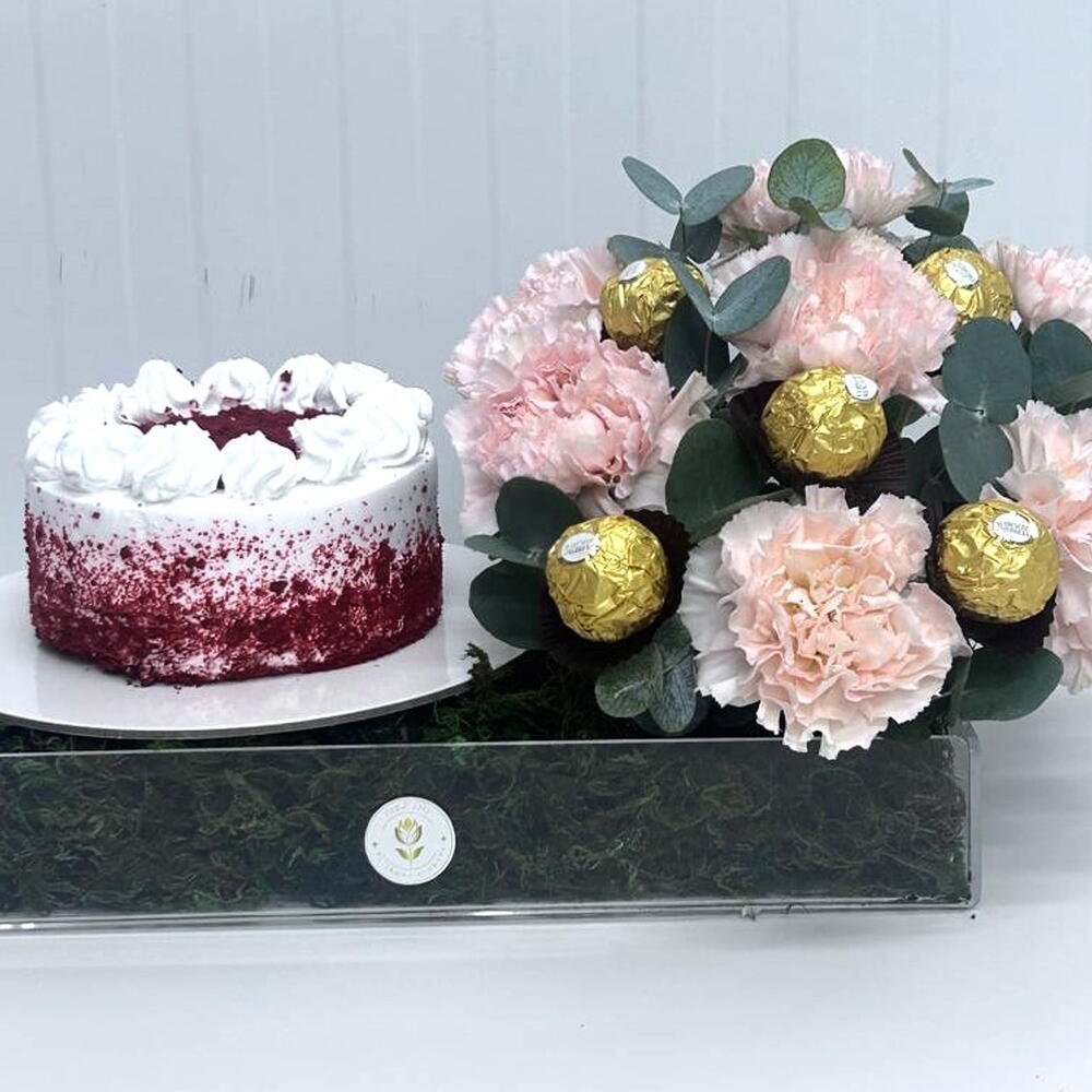 red velvet cake 350gm ferrero chocolate 5 carnation peach 6 eucalyptus leaves 3