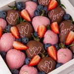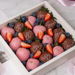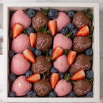 • Fresh strawberries • Milk chocolate covered strawberries • Pink chocolate covered strawberries • Fresh strawberry slices • Fresh blueberries • Decorative chocolate drizzle • Gold edible decoration • Elegant gift box