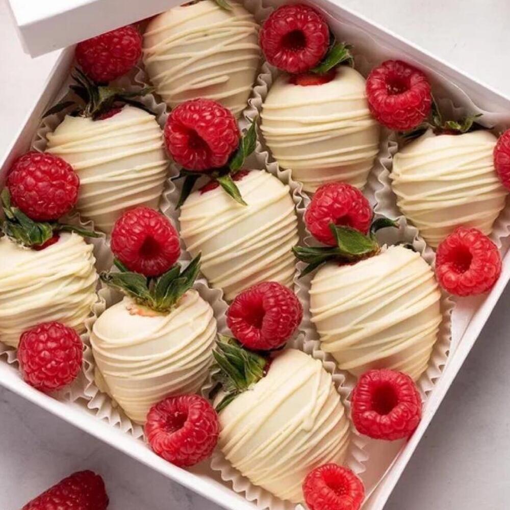 Ingredients Dessert: fresh strawberries , white chocolate Berry Callebaut (sugar, cocoa butter 27.4%, whole milk powder, emulsifier: soy lecithin, natural flavor: vanilla) Confectionery design elements: - fresh strawberries - fresh roseberry