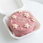 A vintage dream in a box. This petite 200g bento cake is frosted in a velvety dusty pink buttercream, adorned with hand-piped cream blossoms and sprinkled with edible gold and pearl beads. It’s the perfect size for a solo indulgence or a sweet surprise for someone special. Customizable with your personal message