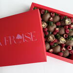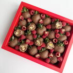 20 Belgian milk chocolate covered strawberries 32 Fresh raspberries, 6 halves of ferrero rocher with gold accents