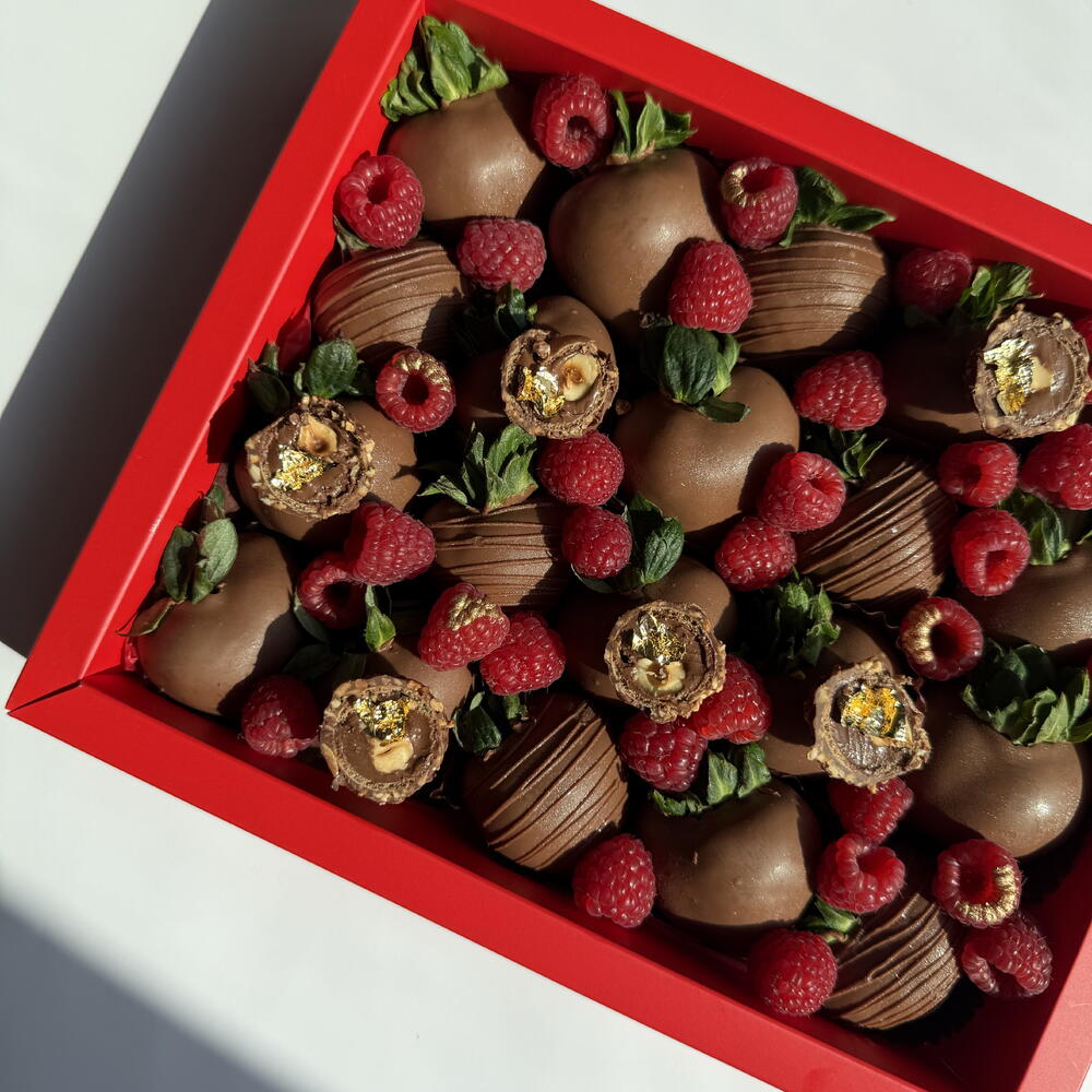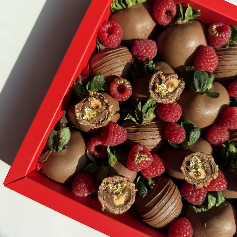 Bold and luxurious, the Fatima Box makes a statement. Milk chocolate covered strawberries are dressed with fresh raspberries, ferrero rocher, and gold accents — designed for high-impact celebrations and unforgettable moments.