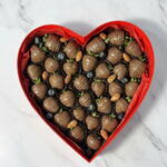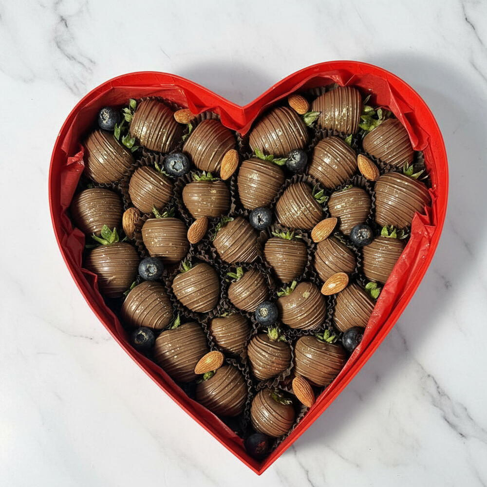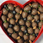 Fresh strawberries - 700 gram Fresh blueberries 100 gram Almonds Milk chocolate: cocoa butter, cocoa mass, whole milk powder, cane sugar, natural lecithin, and vanilla Cocoa solids: min. 33.6% Milk content: min. 20.8% Total fat: 36.2% Producer: Callebaut (Belgium) And for the most sincere emotions, we include the following: - A red gift bag - A red envelope sealed with our seal and real sealing wax with dried flowers, in which we can place your warmest and most sincere wishes for your loved one. - A red heart-shaped box, completely filled with delicious berries, tied with a satin ribbon. The quantity of berries depends on their size. Each berry is packed tightly into the box. The number of berries per box may increase.