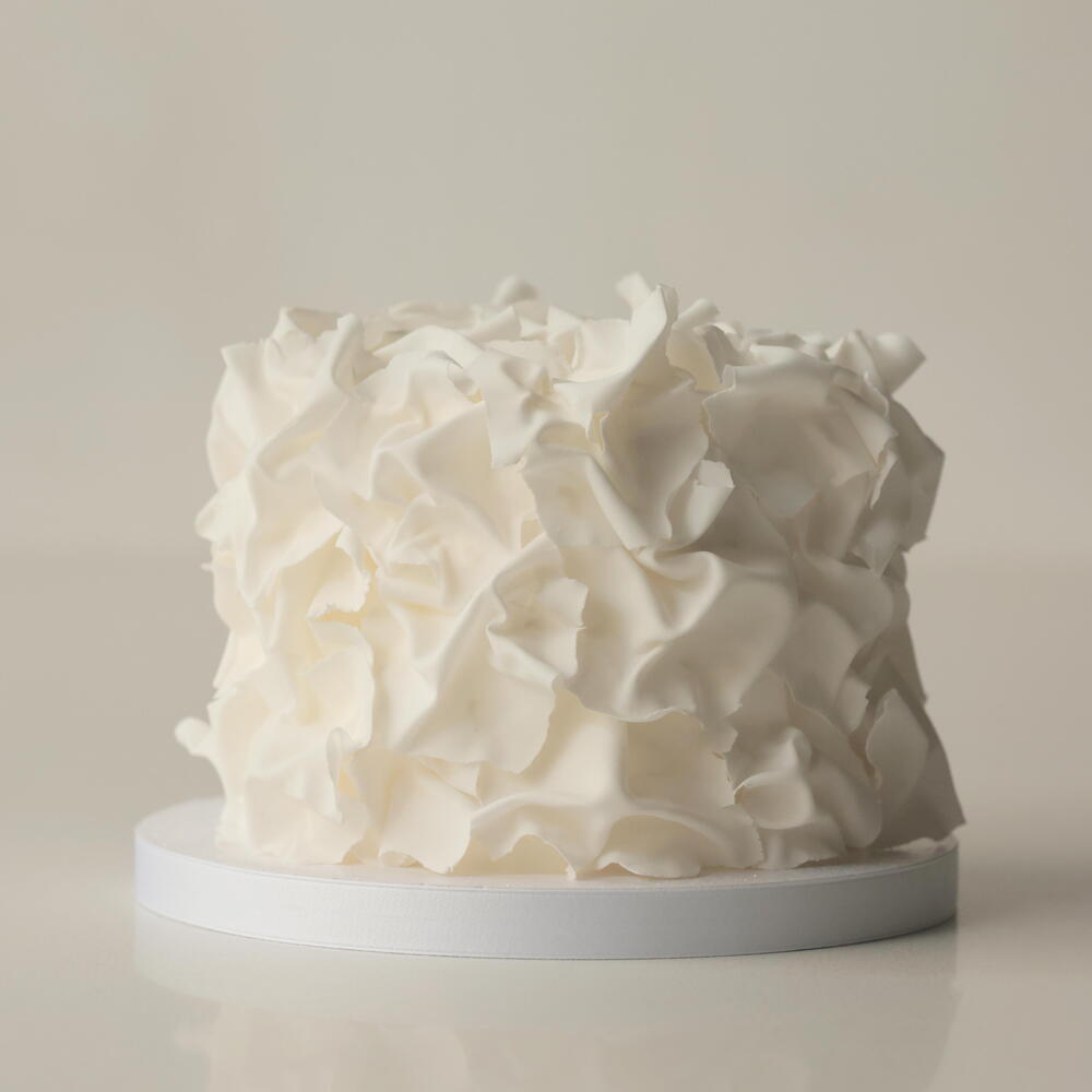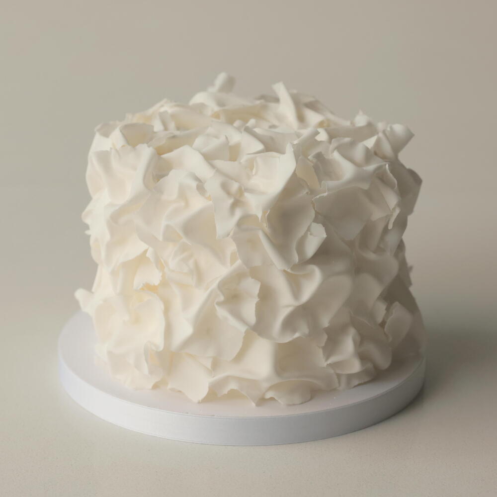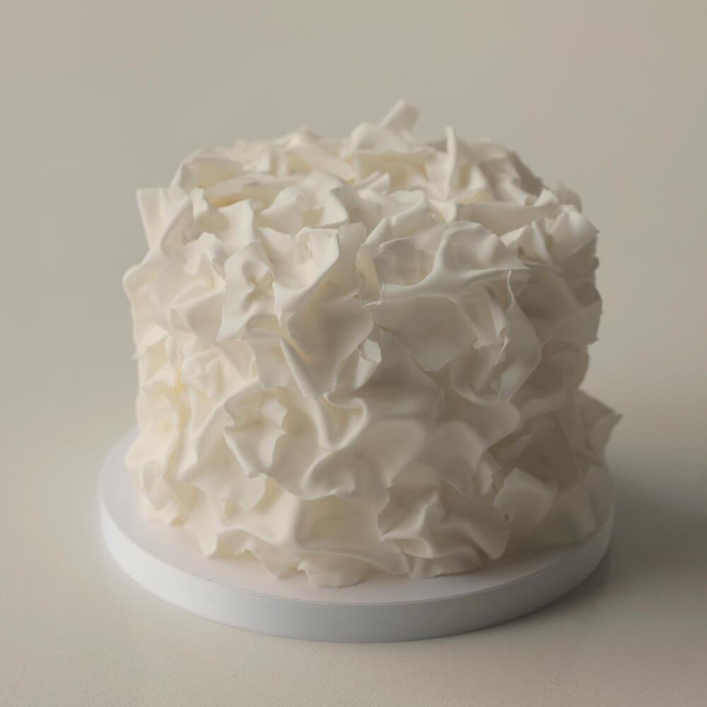 Our M cakes weighing 2.5 kg are designed for 9-10 people. The cake is adorned with fondant ruffles. Default filling: Vanilla-berries. Box size: 30*30*34cm