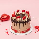A rich chocolate Valentine’s cake featuring a smooth drip finish and topped with heart-shaped decorations. Perfect for chocolate lovers looking for a bold and indulgent Valentine’s treat.