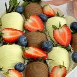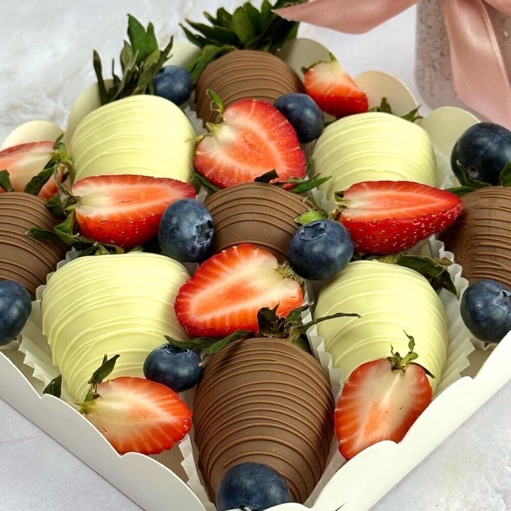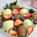 Ingredients Dessert: fresh strawberries; Callebaut milk chocolate (sugar, cocoa butter, whole milk powder, cocoa mass, emulsifier: soy lecithin, natural flavor: vanilla). white chocolate Berry Callebaut (sugar, cocoa butter 27.4%, whole milk powder, emulsifier: soy lecithin, natural flavor: vanilla) Confectionery design elements: - fresh strawberries - fresh blueberries