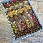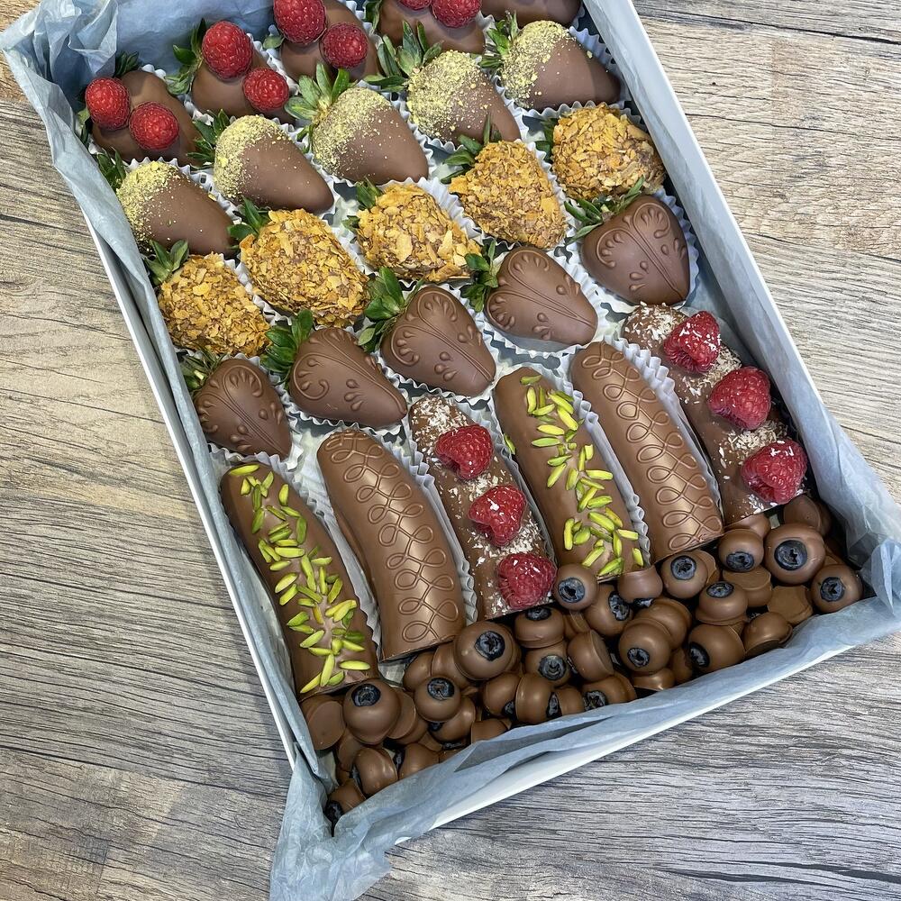 strawberries, blueberries, bananas, raspberries, nuts, Belgian milk chocolate