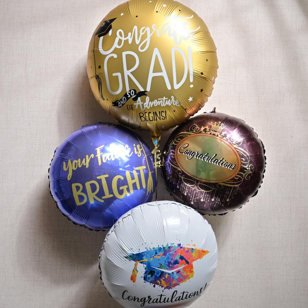 Celebrate the milestone of graduation with this vibrant 4-piece foil balloon set. Perfect for expressing your pride and excitement, these fun and colorful balloons are designed to add a festive touch to any graduation celebration.