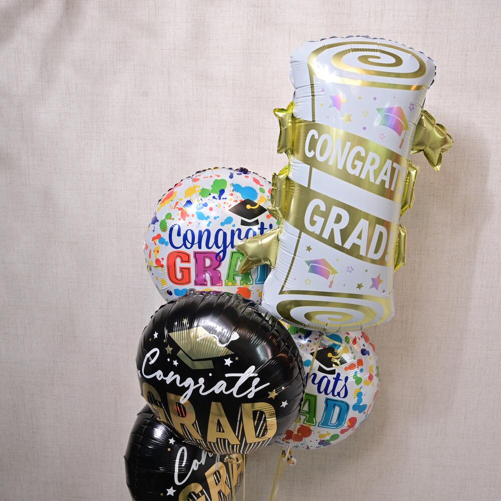 This vibrant and festive 5-piece balloon set is perfect for any graduation celebration. Featuring a mix of colorful and gold-accented foil balloons, this set includes a congratulatory scroll design along with matching Congrats Grad balloons to brighten up the moment.