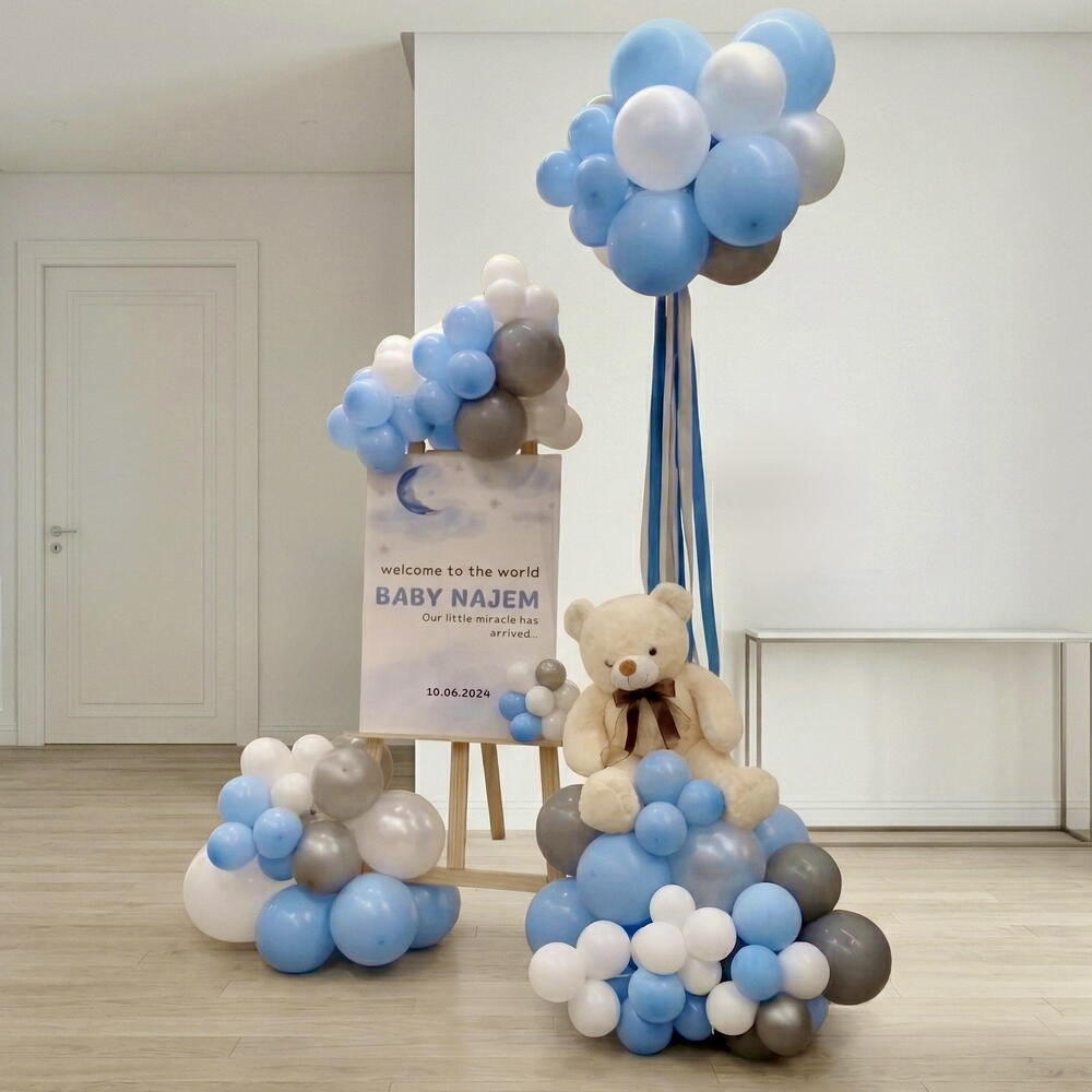 Create a beautiful and memorable welcome for your baby boy with this elegant balloon frame arrangement. This setup features a cute 30cm teddy bear, complemented by a sturdy wooden frame and a foam board, making it perfect for both decoration and photo backdrops. The arrangement includes a balanced mix of balloons: 10 white, 10 blue, and 10 silver balloons (10 inches), along with 20 white, 20 blue, and 10 silver balloons (5 inches). The combination of colors gives a soft, stylish, and premium look, ideal for celebrating a newborn baby boy. Perfect for hospital decorations, baby showers, or welcome home setups, this arrangement adds a charming and joyful touch to your special moments. *Customization is possible as per your preference.