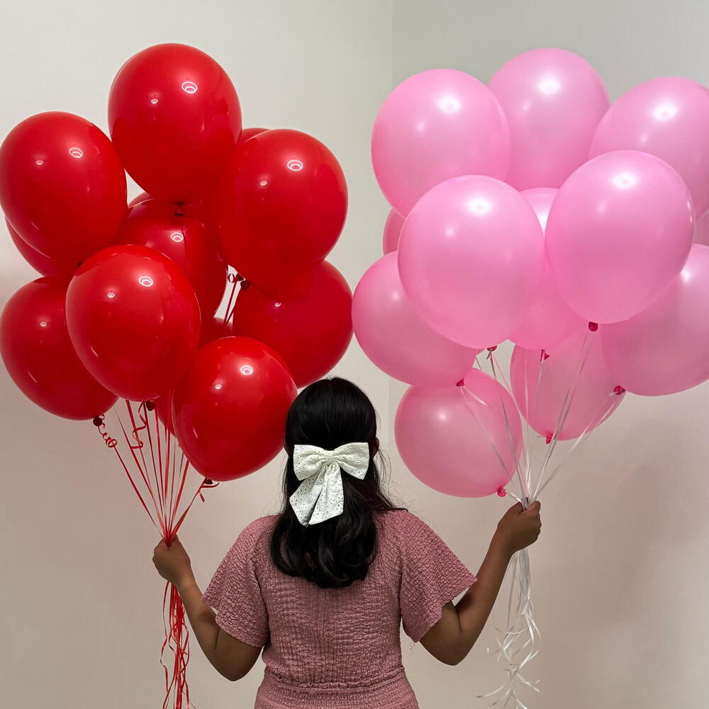 Make any moment feel extra special with this vibrant bunch of 24 helium-filled latex balloons. Featuring 12 bold red balloons and 12 soft pink balloons, this set is a perfect mix of romance and fun. Light, airy, and eye-catching, it instantly elevates any space and sets the mood for celebration. Ideal for Valentine’s Day, Galentine’s parties, anniversaries, birthdays, proposals, or just because—you don’t need a reason to add a little joy. Whether you’re surprising someone special or decorating for an event, this balloon set brings effortless charm and festive vibes. ✨ What makes it special: Fly time 8 to 12 hours 24 premium latex balloons filled with helium Romantic red and pink color palette Perfect for love-filled celebrations and cheerful gatherings A simple yet stunning décor statement