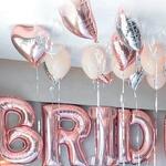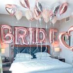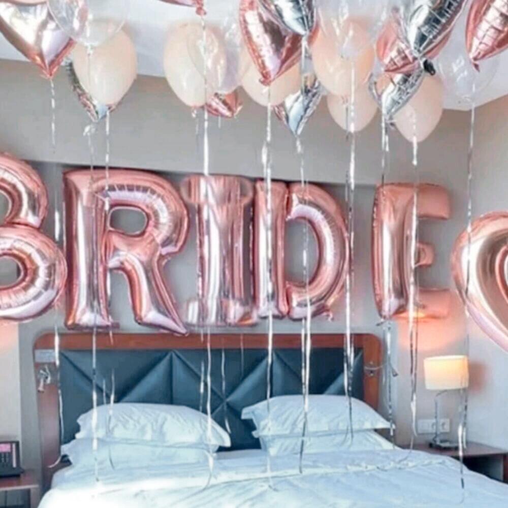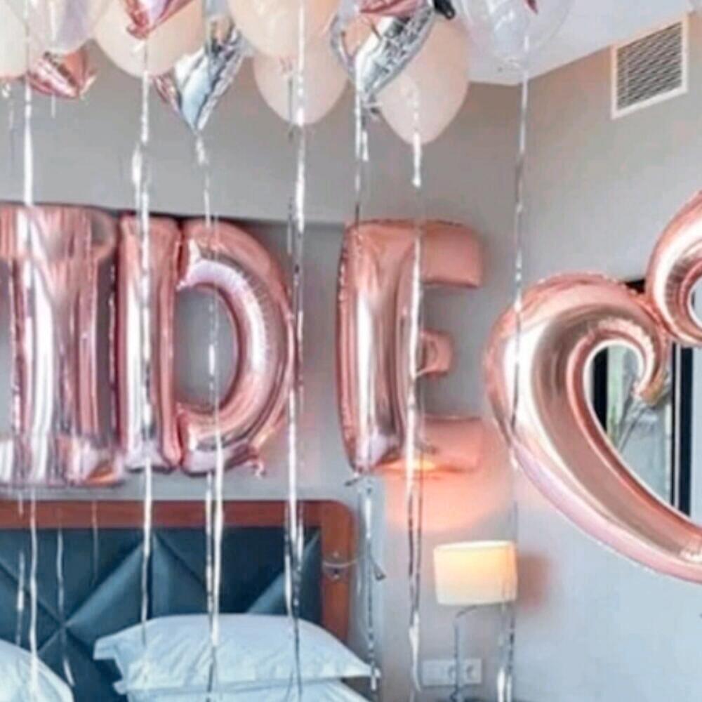 This romantic balloon set creates the perfect atmosphere for a bridal celebration. Featuring rose gold letter balloons spelling out “BRIDE,” paired with elegant heart-shaped and pearl-toned helium balloons, it transforms any space into a dreamy setting. Ideal for bridal showers, hotel room surprises, or bachelorette events, it adds a festive and chic touch to your celebration. To keep the balloons floating longer, avoid exposure to extreme heat or direct sunlight and keep them in a cool, dry place. Letters - 5 pcs. Large heart, flies - 1. Small heart, with helium, flies - 10 pcs. Classic balloons, fly - 9 pcs. Fasteners for letters 5 pcs. We can inflate the letters to fly, but they look more beautiful on the wall.