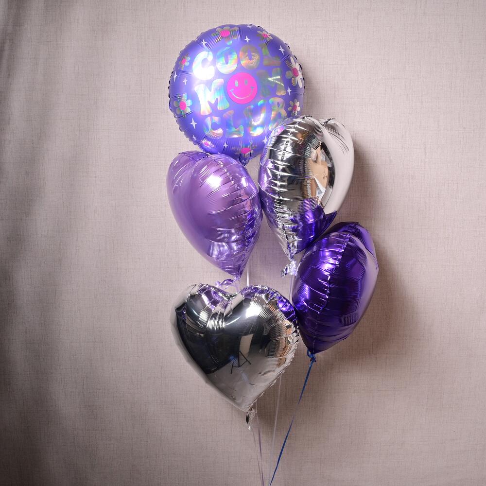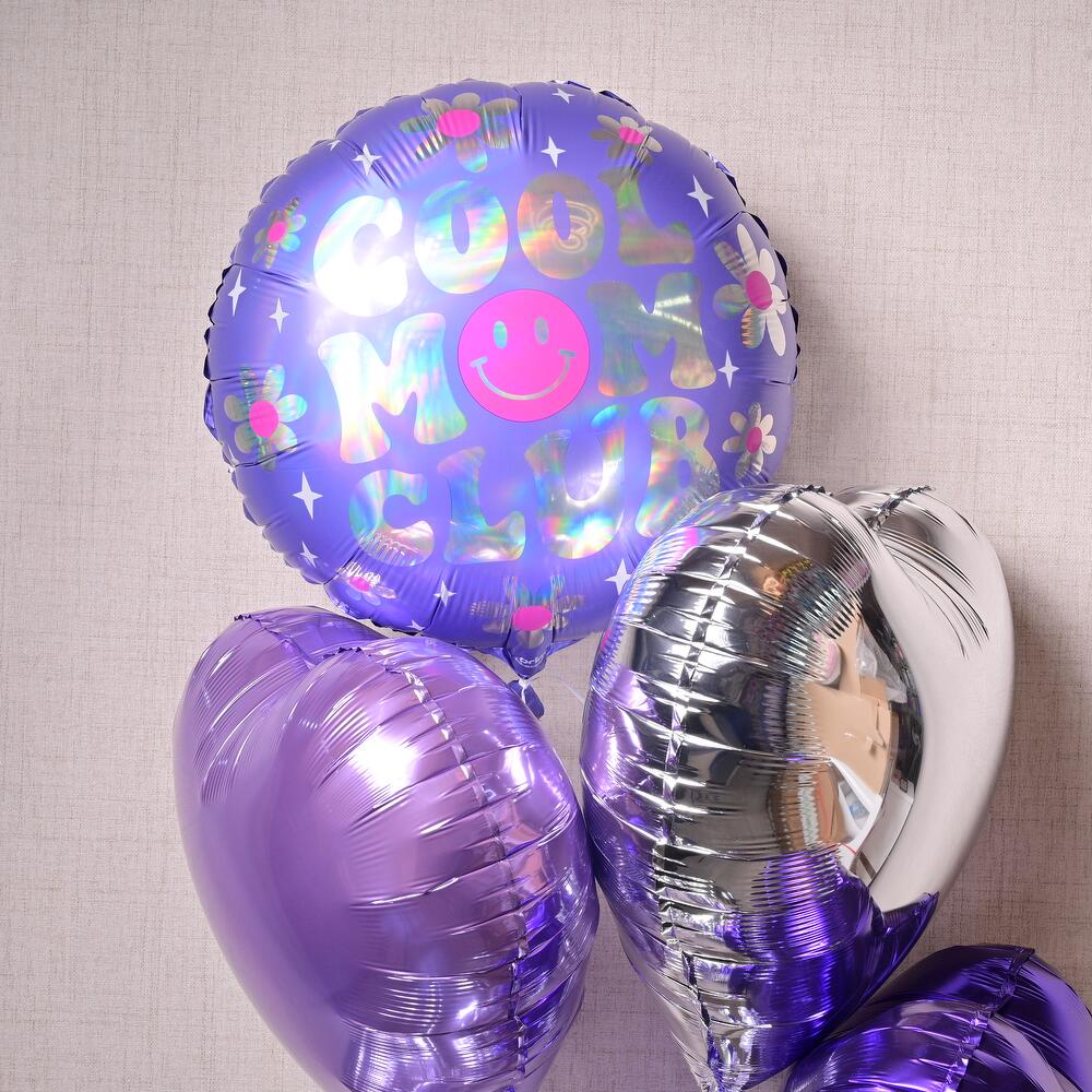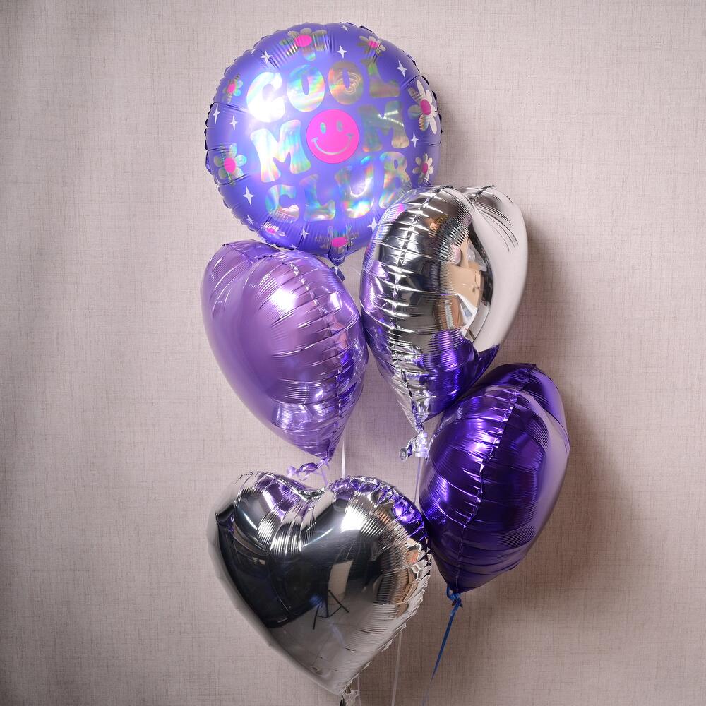 Surprise Mom with this vibrant Cool Mom Club balloon set featuring 1 round foil balloon and 4 heart-shaped balloons — 2 in purple and 2 in silver .Balloons will be filled with helium and weight in the bottom. Helium will last 8-10 hours