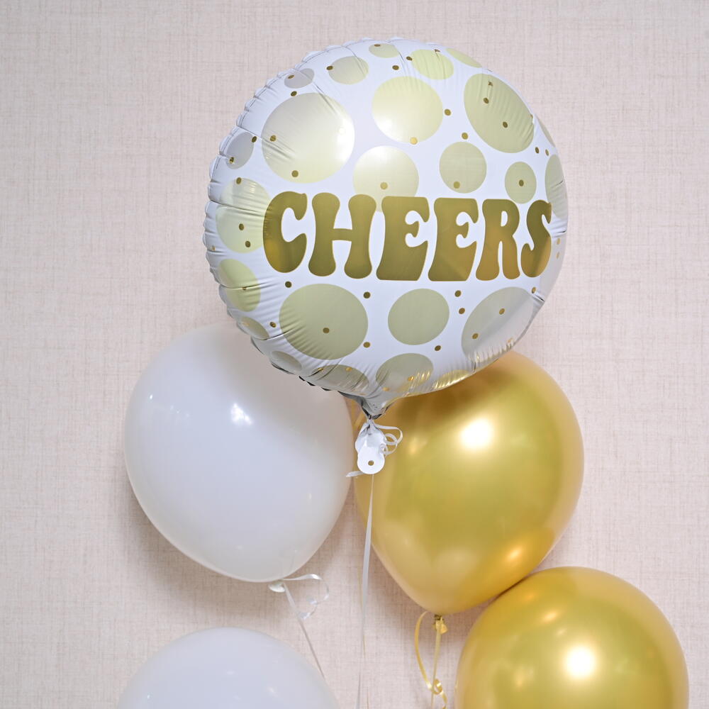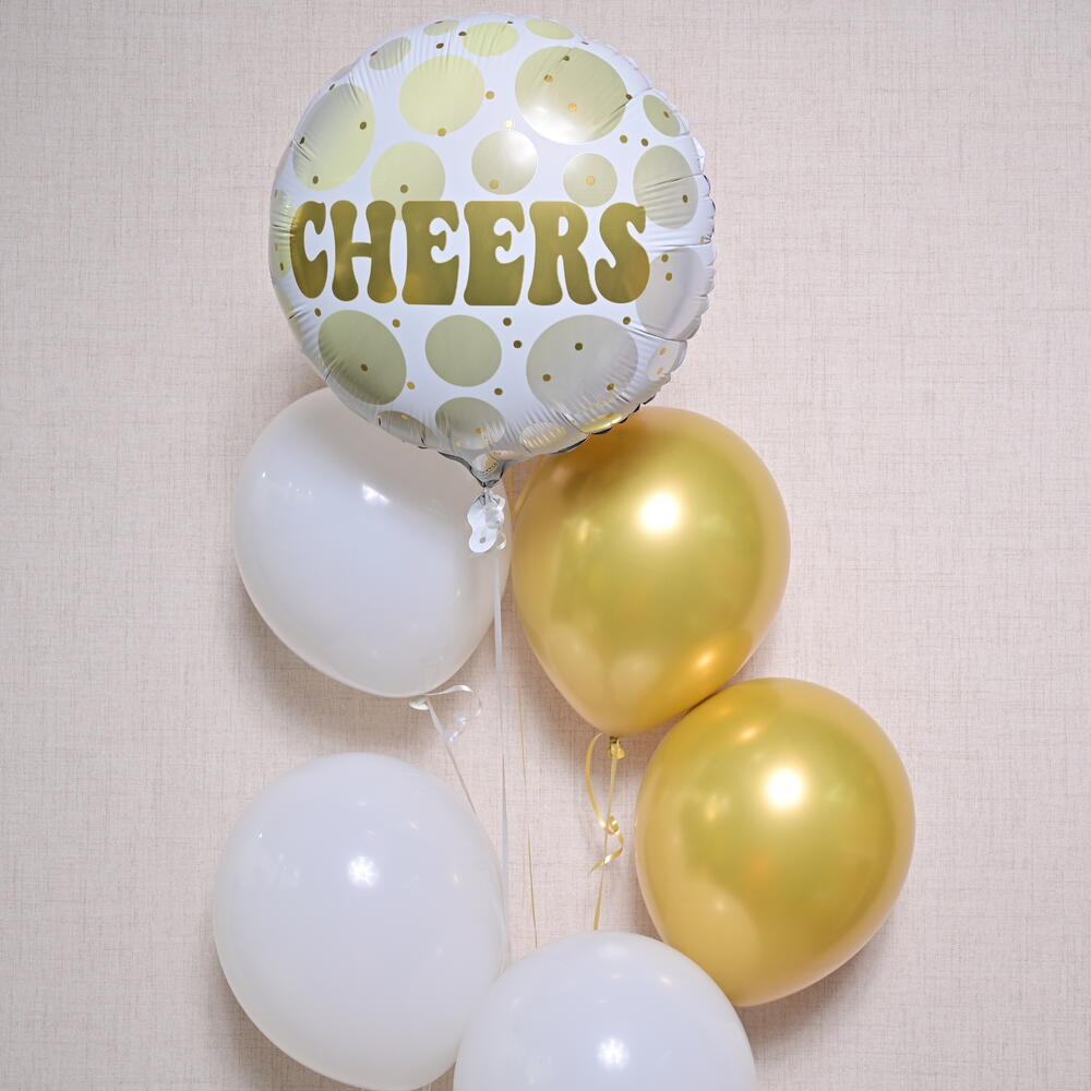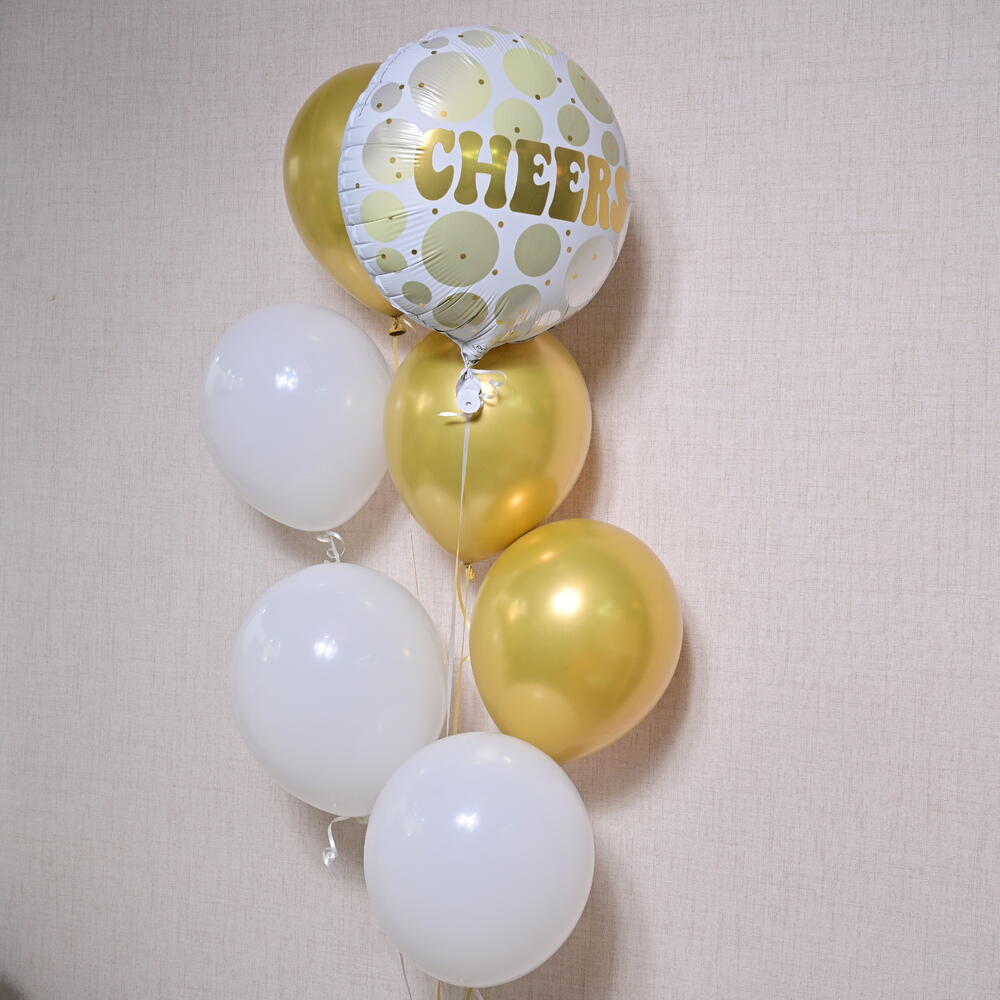 Stunning 7-balloon set includes 1 foil “Cheers” balloon, 3 gold and 3 white latex balloons. Floats 8–10 hours!