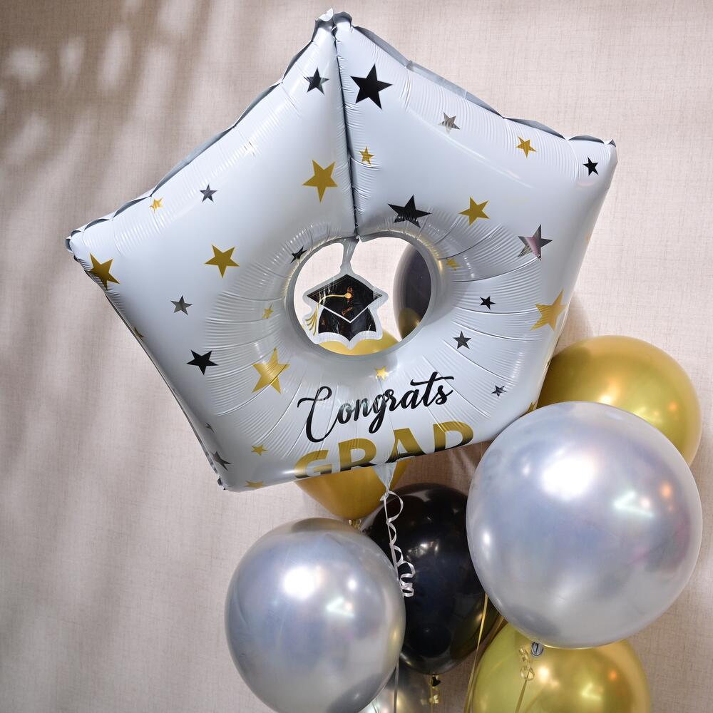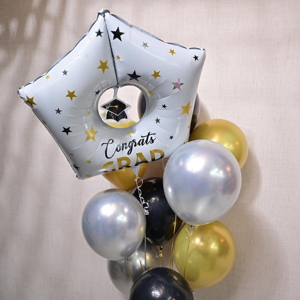 Celebrate the milestone with this perfect graduation balloon set! Featuring a star-shaped foil balloon with Congrats GRAD and 12 latex balloons in gold, silver, and black, this set is designed to add vibrance and excitement to the occasion.