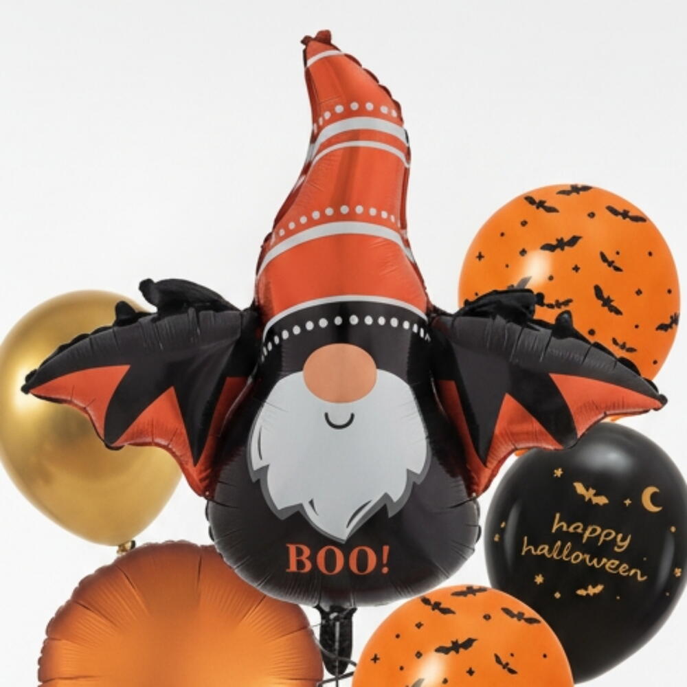 Bring some festive fun to your Halloween celebrations with this adorable gnome-themed balloon bouquet! Featuring a charming gnome with bat wings, Happy Halloween and Boo! balloons, and classic orange and black designs, its perfect for parties, haunted gatherings, or simply adding a touch of spooky cheer to your home. Helium-filled and ready to delight! 1 ghost 19 foil balloon 2 round 18 foil balloon 4 latex balloons 12