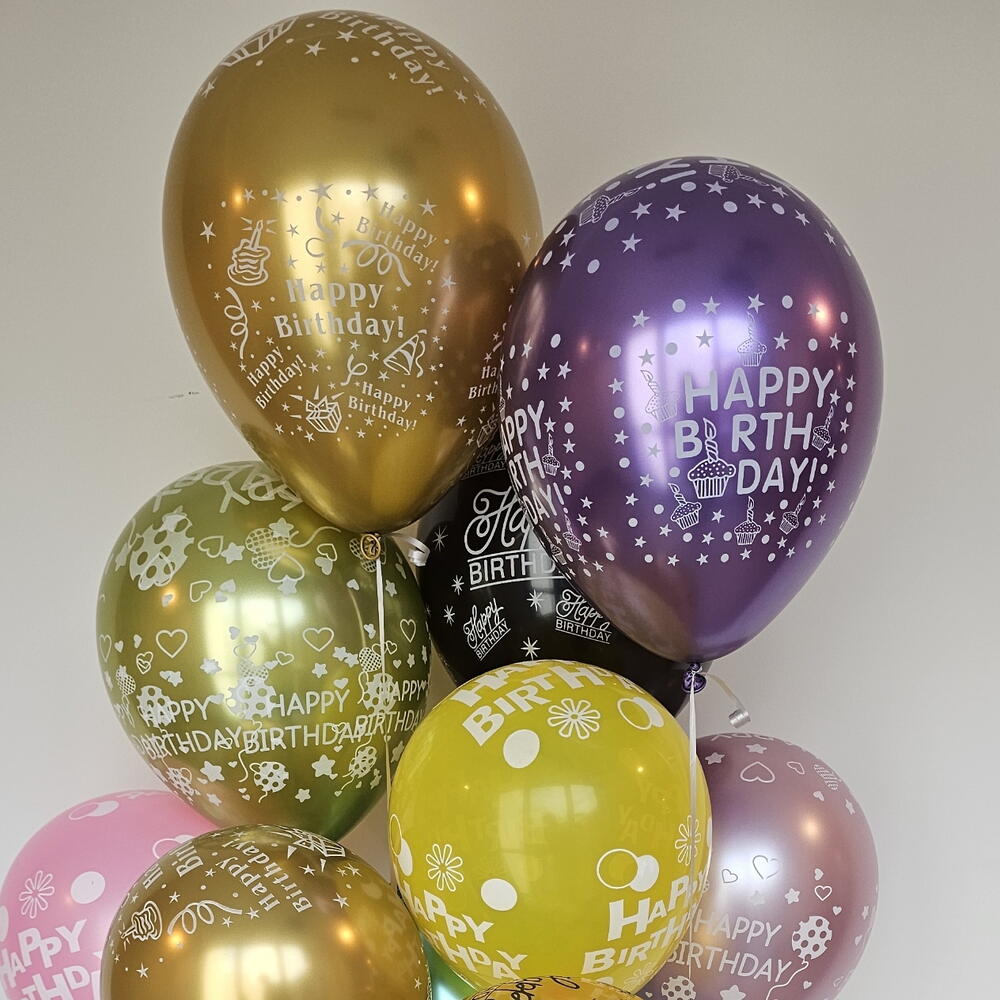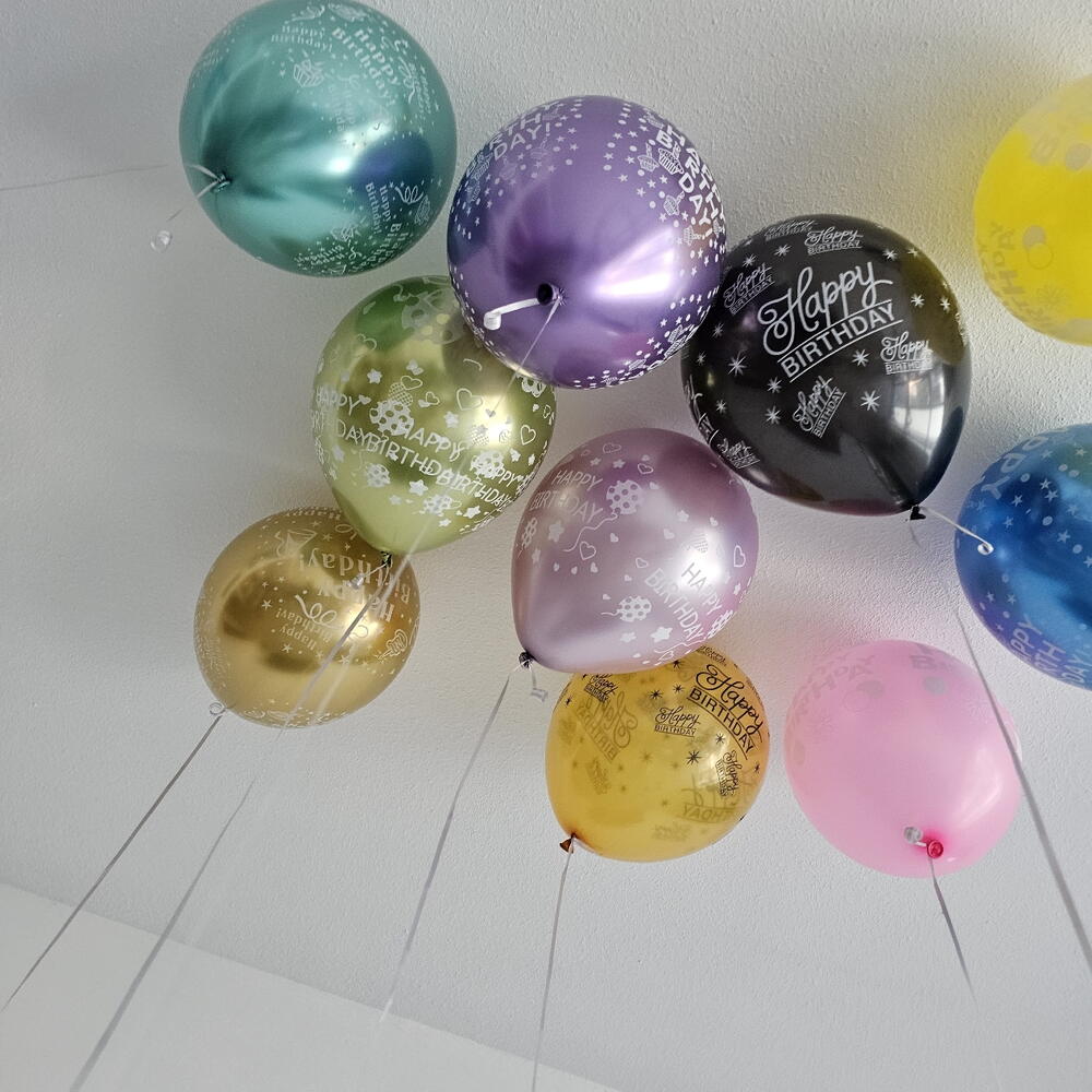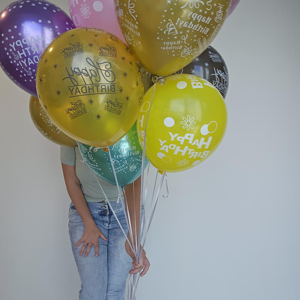 Mix color ballons set with text Happy birthday , 11 pc Floating time 8-24 hours (depends on the temperature in your home and other conditions) Each extra ballon 13 aed