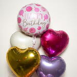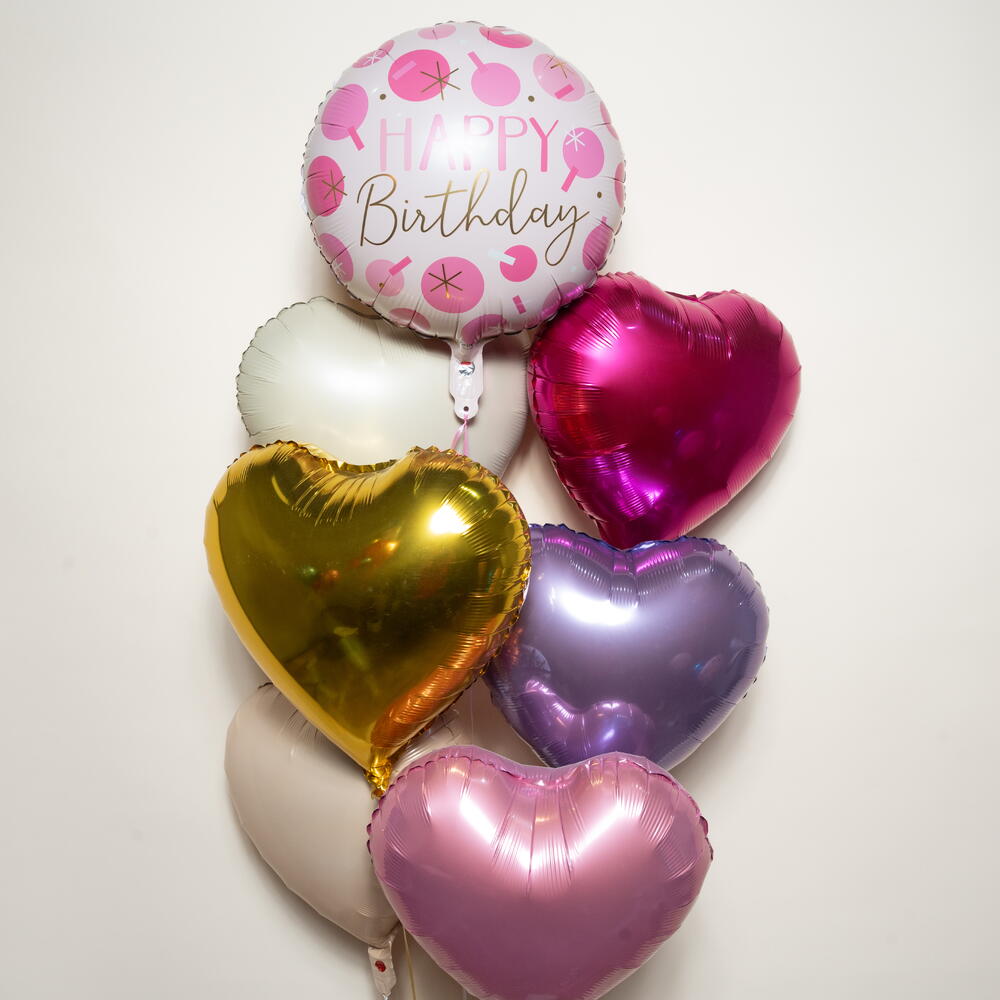 Celebrate birthdays in a bright and cheerful way with this Happy Birthday with 6 Heart Foil Balloons Set (7 balloons). The arrangement features 1 round “Happy Birthday” foil balloon paired with 6 heart-shaped foil balloons in a mix of elegant colours, creating a full and eye-catching display. Perfect for birthday parties, room décor, and photo moments, this foil balloon set offers a helium float time of approximately 8–10 hours, making it ideal for same-day celebrations 🎈🎂