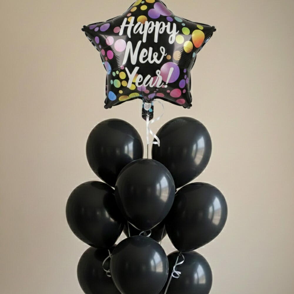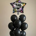 Happy New Year Balloon Bunch - Helium Included Included: 1 x 18-inch star shaped New Year foil balloon 8 x 12-inch black latex balloons