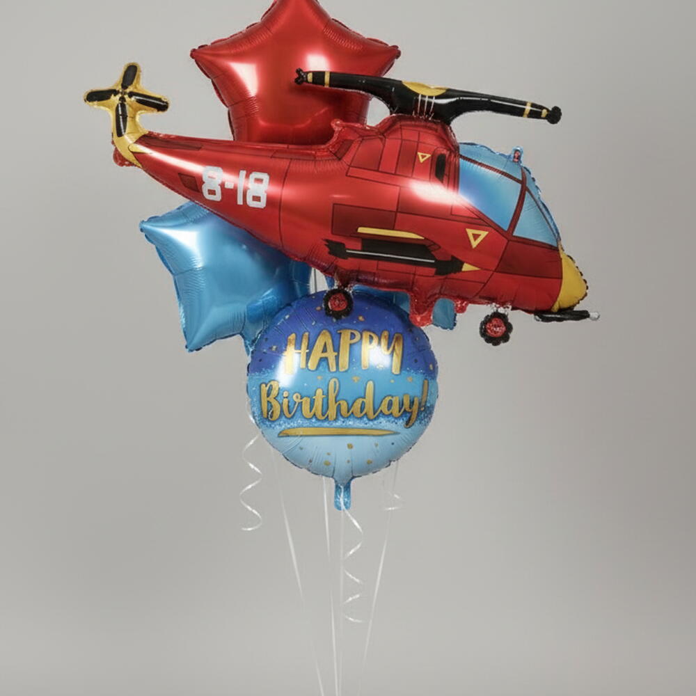 Get ready for an aerial adventure with our Inflated Helicopter Birthday Balloon Bouquet! This exciting, ready-to-party delivery features a spectacular large red helicopter foil balloon (approx. 35 inches), two vibrant star-shaped foil balloons (red and blue, approx. 18 inches), and a Happy Birthday round foil balloon (approx. 18 inches), all helium-filled and tied together. Perfect for boys birthday parties, transportation themes, or a thrilling surprise delivery. Our helium balloons arrive inflated, making your celebration setup effortless!