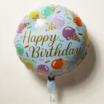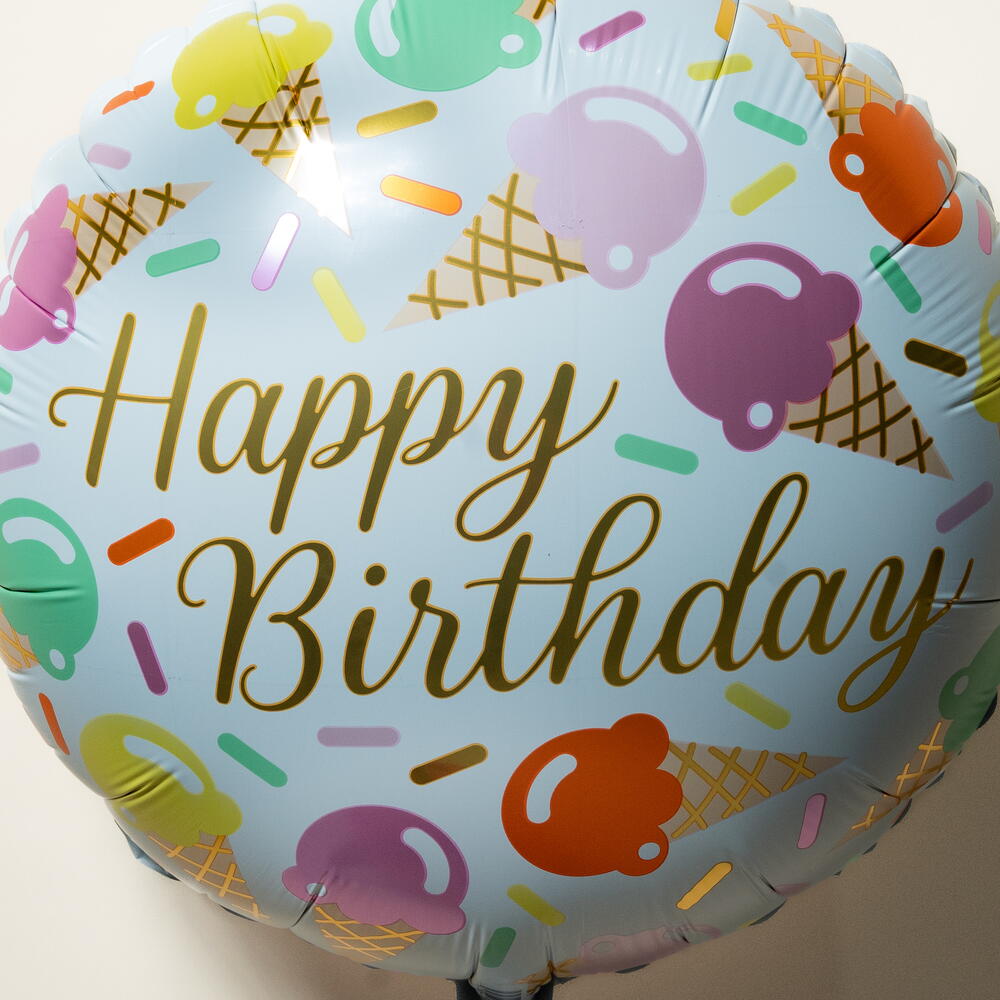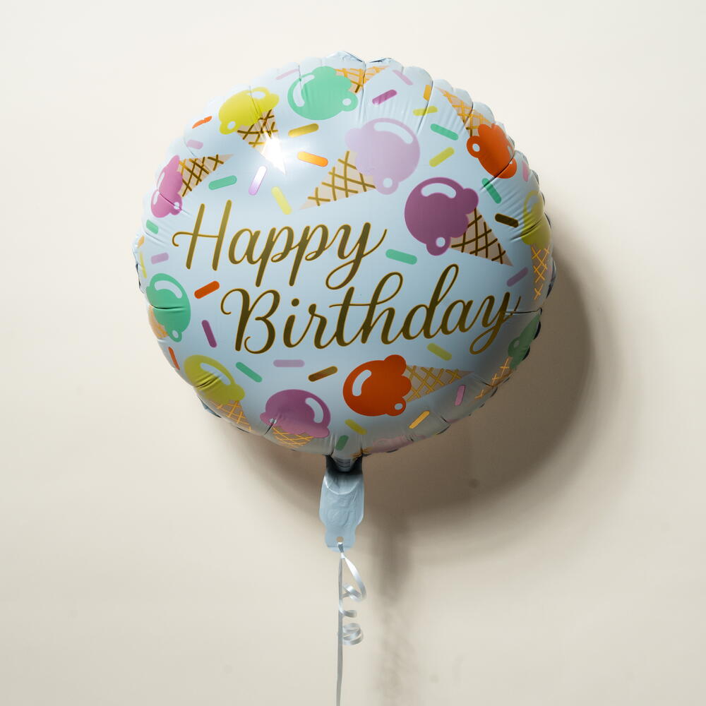 Celebrate in a sweet and cheerful way with this Round “Happy Birthday” Foil Balloon, featuring a playful ice-cream and sprinkle design that adds instant fun to any birthday celebration. The friendly pastel tones and whimsical artwork make it perfect for kids’ parties, summer birthdays, or anyone who loves a lighthearted, joyful theme. Made from durable, high-quality foil, this balloon has a smooth, glossy finish and is designed to hold its shape throughout your event. It comes pre-filled with helium and includes a ribbon for easy display. With a helium float time of approximately 8–10 hours, it works beautifully on its own or paired with other balloons to create a colorful and festive birthday arrangement.
